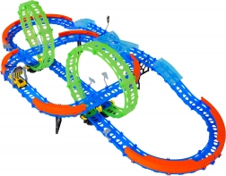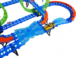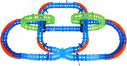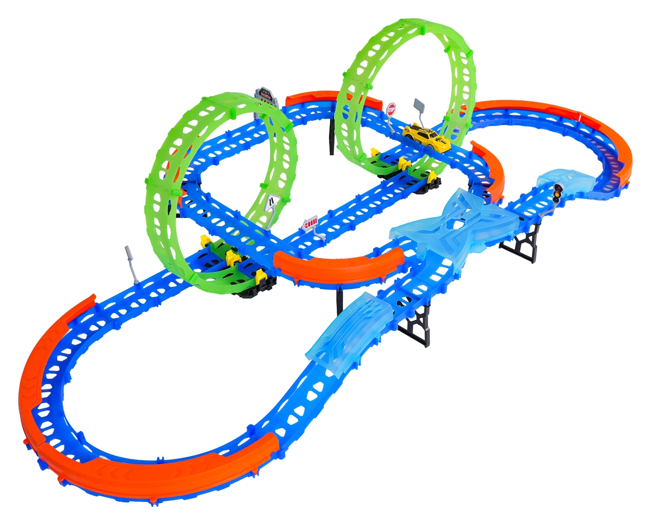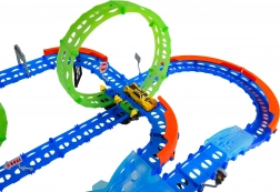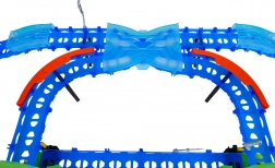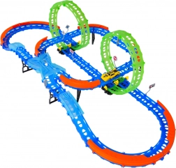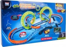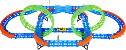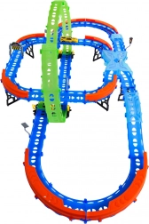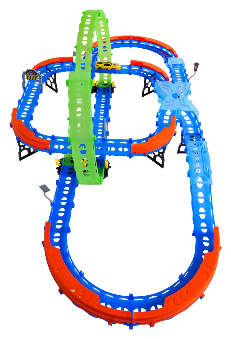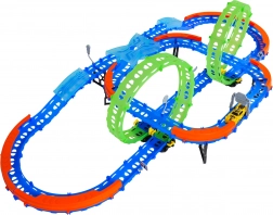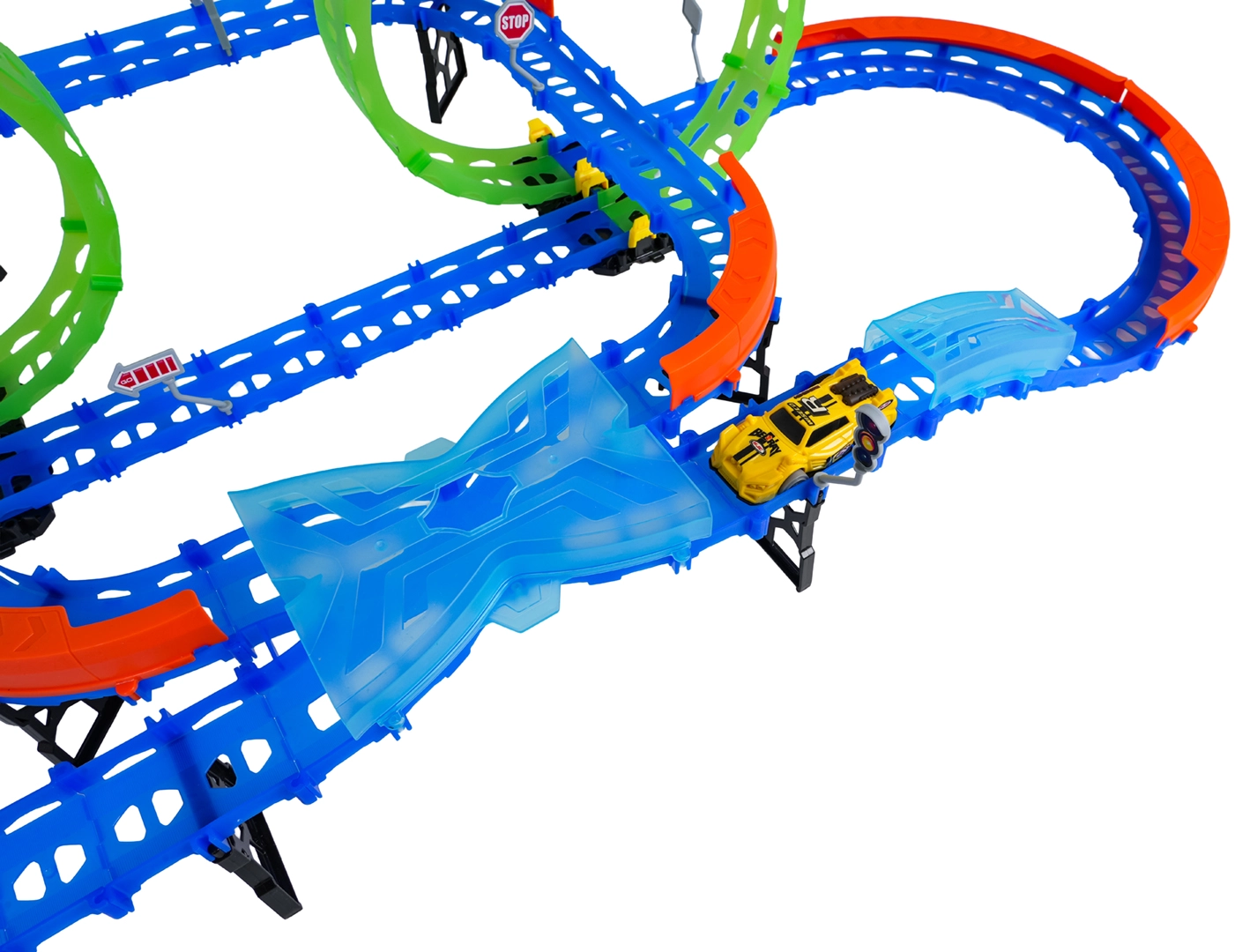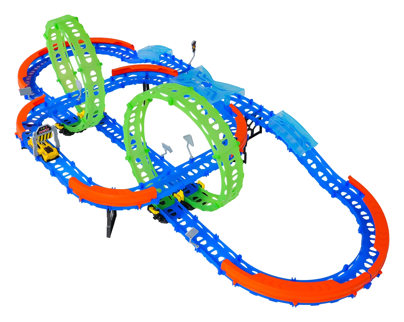 Bouw een kleurrijke baan met bruggen, bochten en twee loops en kijk hoe het autootje met hoge snelheid voorbij zoeft. De fluorescerende elementen lichten op in het donker na belichting, waardoor de races nog actieger en leuker worden.