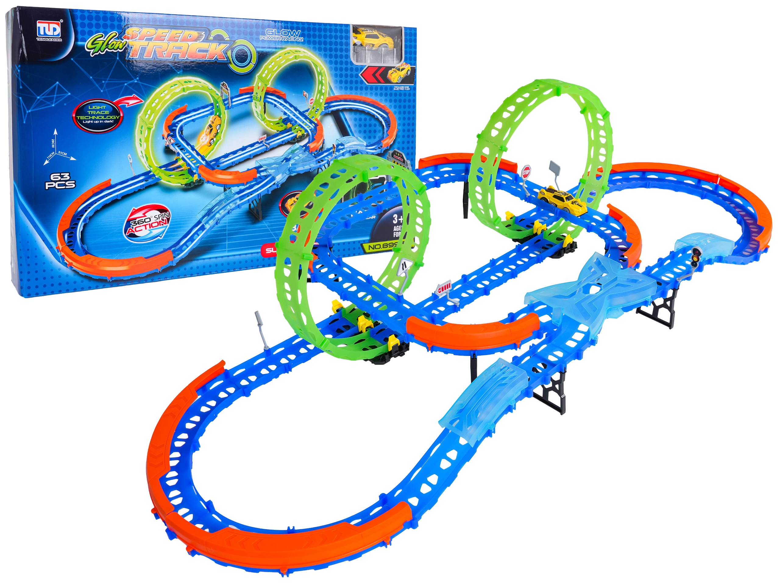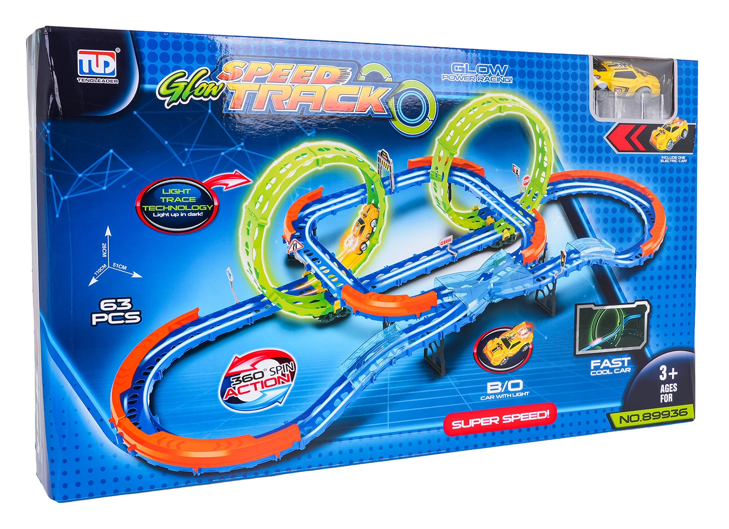 Laat de fantasie los met een leuke raceset voor kinderen vanaf 3 jaar. Deze lichtgevende racebaan biedt 2 fluorescerende 360°-loops, scherpe bochten met veiligheidsbarrières en een snel autootje met verlichting. Met 63 eenvoudig koppelbare delen bouwen kinderen hun eigen baan en genieten ze van spannende ritten, ook in het donker.