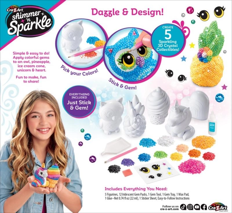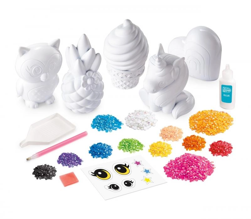 Ontdek een wereld vol glans en fantasie met deze creatieve set voor kinderen! In de verpakking vind je 5 witte 3D figuurtjes (uil, eenhoorn, ananas, ijsje en regenboog/hart), gekleurde steentjes, lijm en hulpmiddelen voor eenvoudige applicatie. Dankzij de set ontwikkelen kinderen hun fijne motoriek, geduld en creativiteit en maken ze sprankelende decoraties of cadeautjes voor vriendjes.