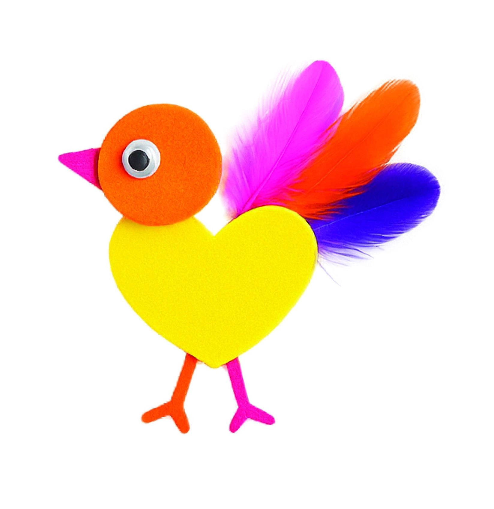 Met foamen vormen, oogjes en kleurrijke veren maak je schattige vogeltjes en andere dierenfiguurtjes – ideaal voor snelle projecten voor kleine makers.