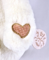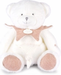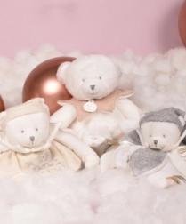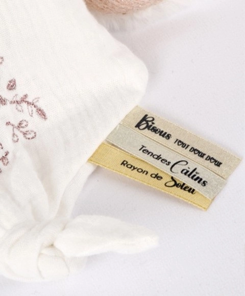 Het design is verfraaid met een subtiele Doudou-borduursel en satijnen lintjes met lieve Franse boodschapjes, wat de hele set een elegante en liefdevolle uitstraling geeft. Het beertje heeft een roze hartje op het pootje, een kraagje onder de hals en zachte pootjes – een perfect cadeau voor een pasgeborene.