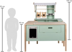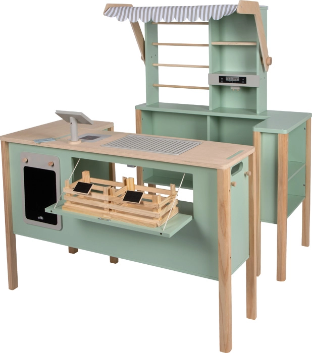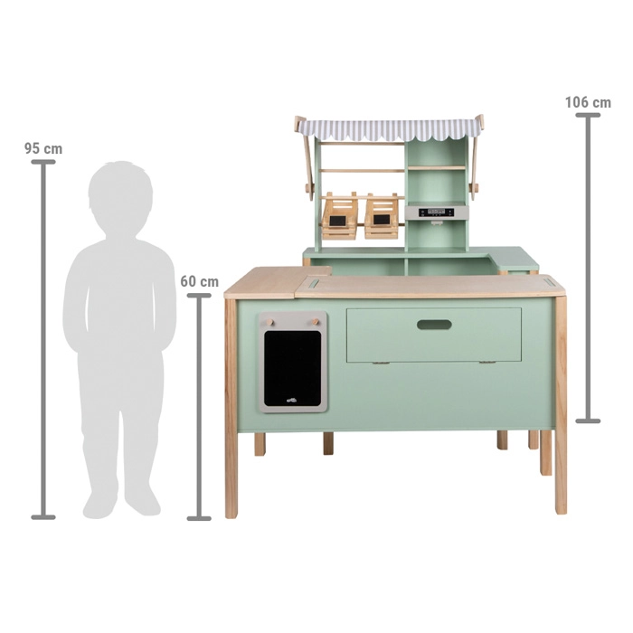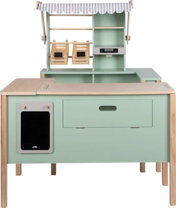 Deze stijlvolle set combineert een kinderwinkel en een keuken in één. Kinderen kunnen spelen dat ze een winkel, café, marktkraam of thuischef zijn. De modulaire elementen zijn flexibel om te bouwen – van kassa met scanner en display tot gootsteen met kraan, koffiezetapparaat, grill/kookplaat en oven of koelkast.