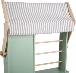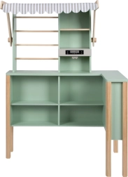 De gedetailleerde uitrusting zorgt voor realistisch spel: scanvlak met display, koffiezetapparaat, gootsteen, kookplaat met grill, oven/koelkast, verkoopmandjes met prijskaartjes, prikbord met aanbiedingen en een afneembare luifel. De robuuste houten constructie is duurzaam en veilig, ideaal voor elke dag.