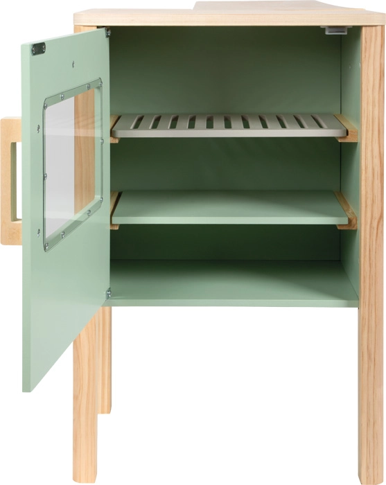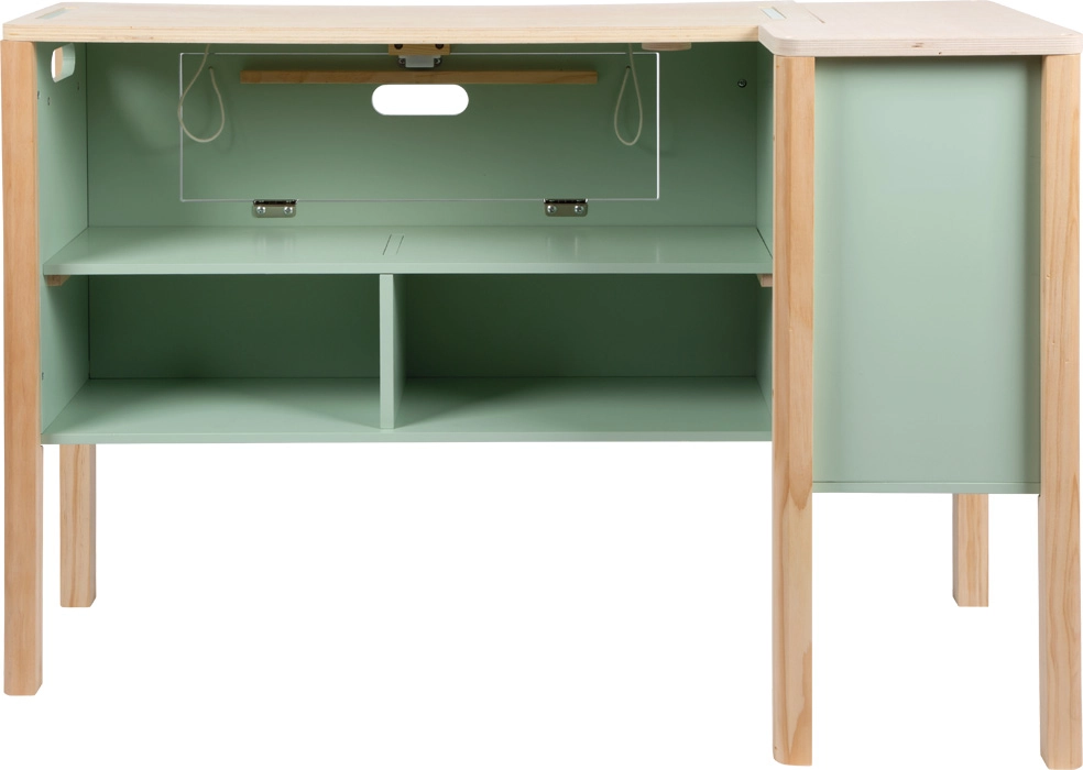 Flexibele modules maken het mogelijk de set om te bouwen tot winkel, café of keuken. Na het spelen schuif je ze gemakkelijk tegen elkaar om ruimte te besparen in de kinderkamer.