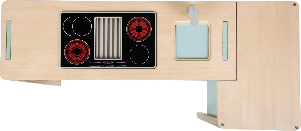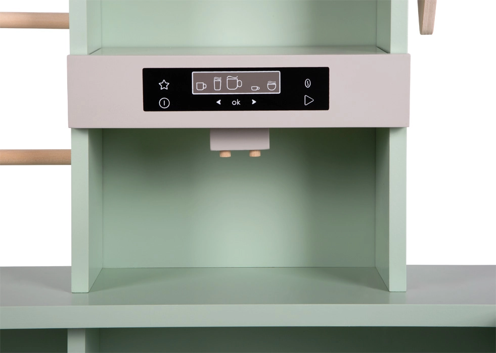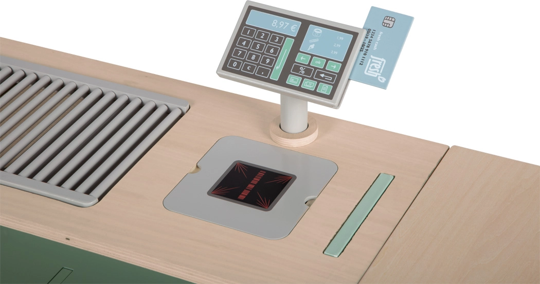 Scanvlak met display, koffiezetapparaat, gootsteen met kraan, grill/kookplaat, oven of koelkast en verkoopmandjes met prijskaartjes ondersteunen authentiek rollenspel.