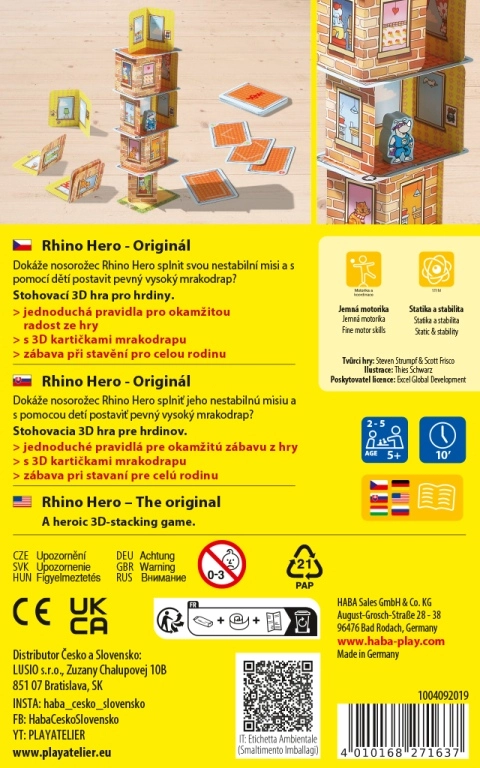 Inhoud en verloop van het spel: Spelers leggen om beurten muren en plafonds volgens de symbolen op de kaarten en verplaatsen de Rhino Hero-figuur over de steeds hogere toren. Wie een vaste hand houdt en de wolkenkrabber niet omver laat gaan, wint!