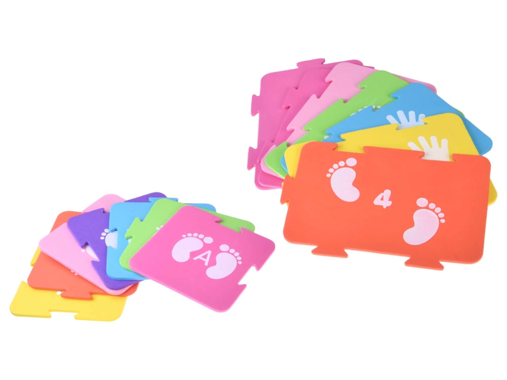 Elk puzzelstuk is bedrukt met witte afdrukken, letters en cijfers. Kinderen oefenen spelenderwijs oriëntatie, geheugen en logisch denken.
