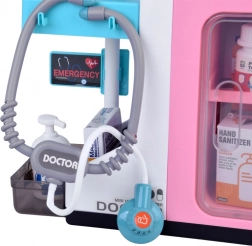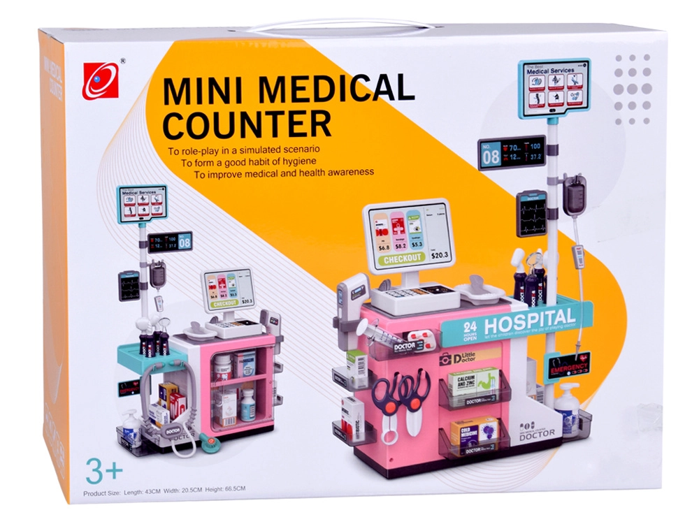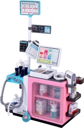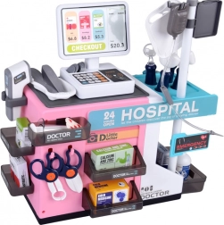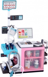 Het complete medische station met apotheekbalie, kastjes en planken laat kinderen spelen als arts, apotheker en kassamedewerker. Een stethoscoop met hartslaggeluid en een piepende thermometer geven het spel authenticiteit, terwijl de kassa met kaartlezer kinderen leert betalen met kaart en contant geld.
