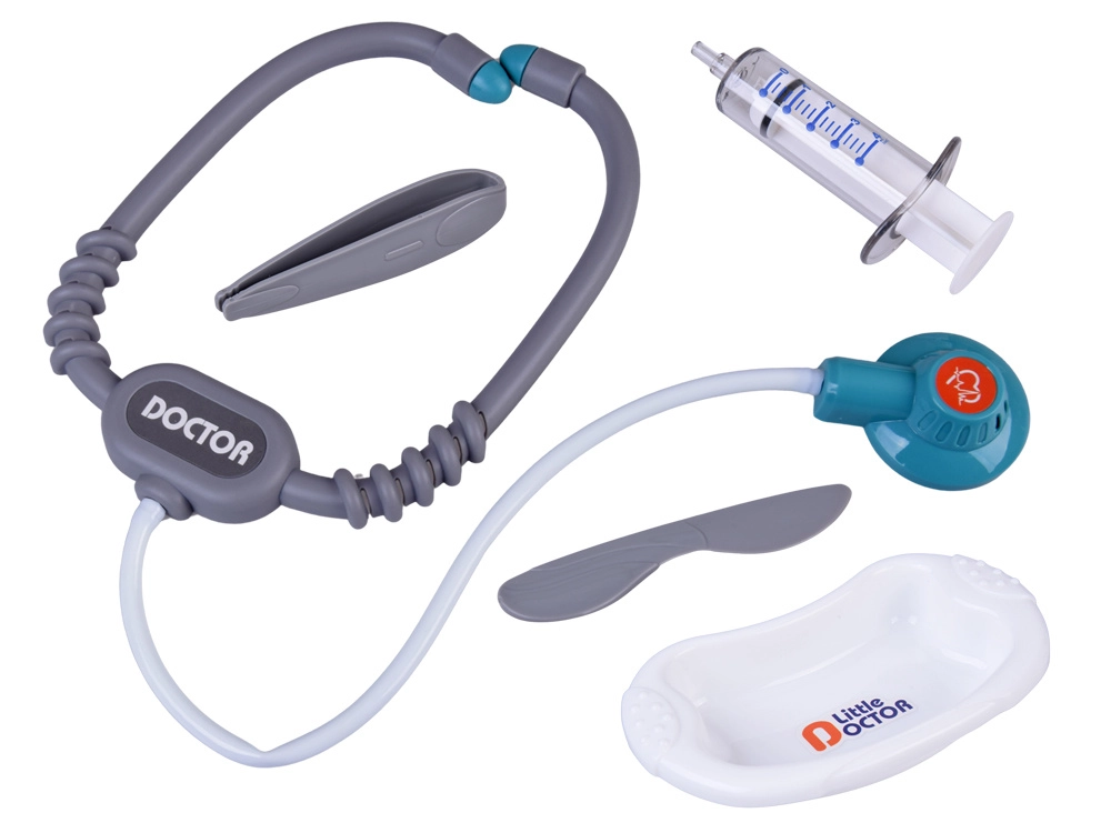 - Realistische accessoires: stethoscoop, thermometer, injectiespuit, otoscoop, schaar, pincet, flesjes en medicijndoosjes