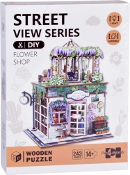 Ontdek de charme van miniaturen met een gedetailleerd model van een bloemenwinkel, dat na het bouwen wordt verlicht door zachte LED-verlichting en een magische sfeer creëert. Door de ramen kijk je uit op een rijk ingericht interieur met planken en boeketten; het dak is versierd met een prieel en klimmende bloemen. De stabiele constructie van hoogwaardig hout is prachtig als stijlvolle woondecoratie en als origineel cadeau.