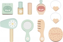 Inclusief föhn, kam, handspiegel, parfum, oogschaduw, poeder, lippenstift, “mascara” en twee haarelastiekjes. Alles van prettig aanvoelend hout in pastelkleuren.