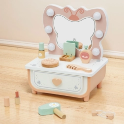 De verlichte spiegel biedt 3 standen – koel, warm en gemengd – voor realistische “make-up”. Op het blad is voldoende ruimte voor accessoires en de uitschuiflade houdt alles overzichtelijk opgeborgen. Spelen met de kaptafel stimuleert zelfstandigheid, logica, fijne motoriek en sociale vaardigheden.