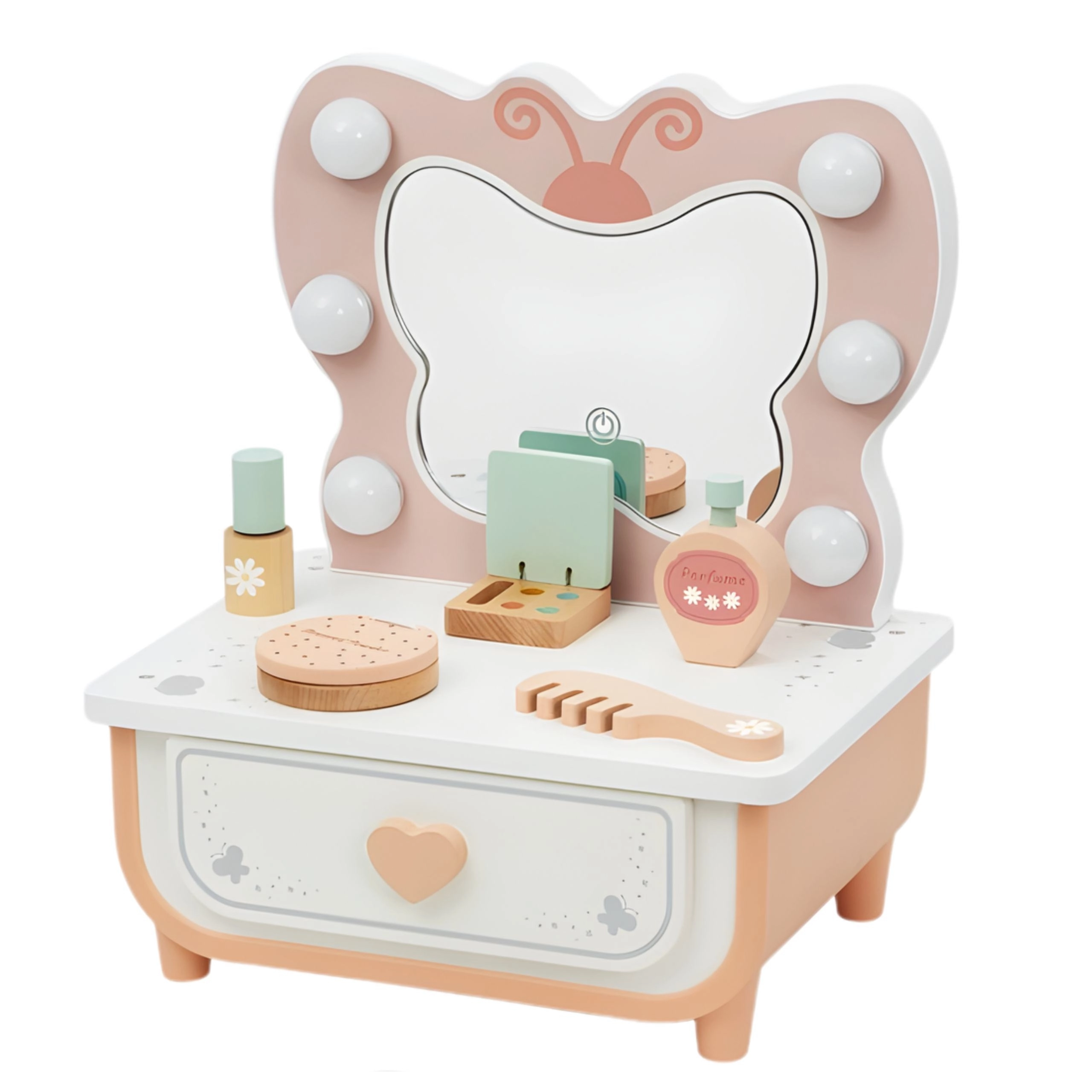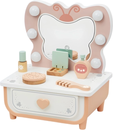 Een schattige houten kaptafel van TOOKY TOY met vlinderspiegel en LED-verlichting tovert de kinderkamer om tot een beautysalon. Bevat een uitgebreide set accessoires voor de rol van visagist en kapper, waaronder een föhn, kam, lippenstift en parfum. Dankzij de veilige houten accessoires, de praktische lade en drie lichtstanden is hij ideaal voor creatief spel en het ontwikkelen van fijne motoriek en fantasie bij kinderen vanaf 3 jaar.