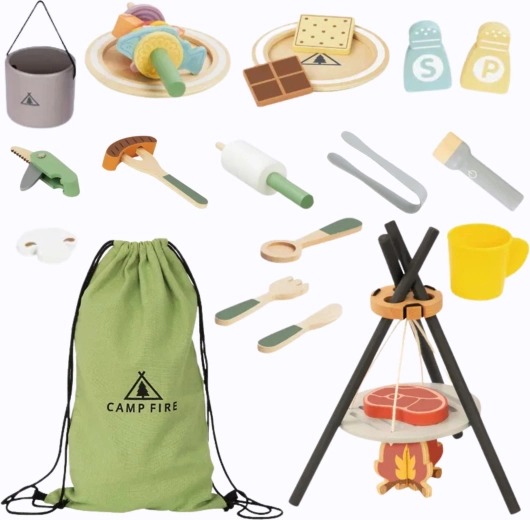 Deze originele set neemt kinderen mee in de wereld van kamperen: tenten, kampvuren en samen koken met vriendjes. De houten onderdelen voelen prettig aan, zijn duurzaam en veilig voor dagelijks spel. Ideaal voor kinderen vanaf 3 jaar die graag volwassenen nadoen en sociale vaardigheden oefenen.
