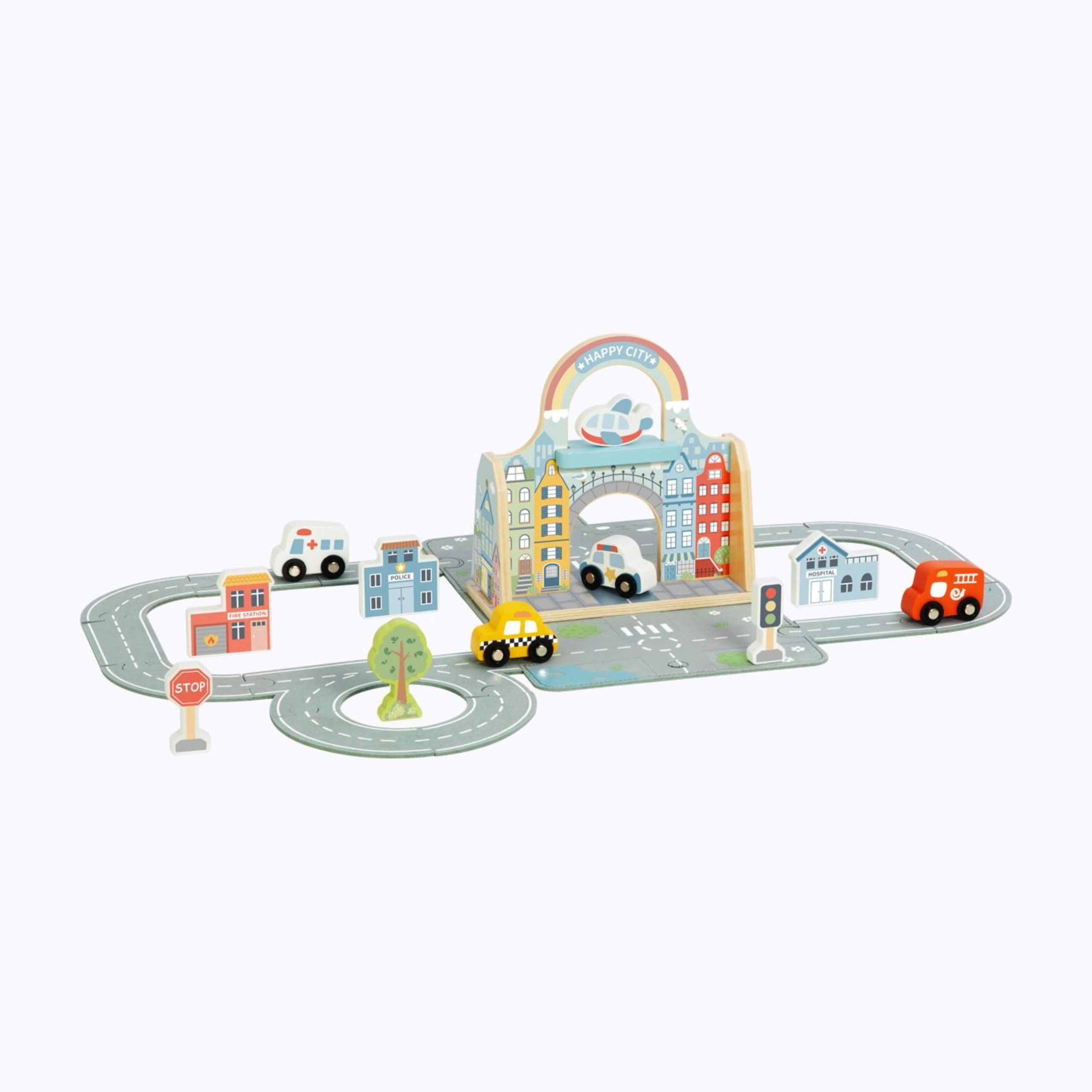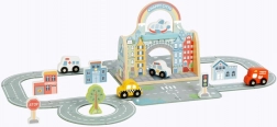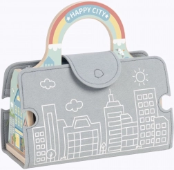 Deze creatieve houten set tovert elke tafel om tot een bruisende stad. De vilten wegen zijn eenvoudig in verschillende routes te leggen; het kleine autootje rijdt door de stadspoort, langs het verkeerslicht en de verkeersborden. De draagbare constructie in de vorm van een tas maakt het mogelijk de hele stad mee te nemen – naar opa en oma of op vakantie.