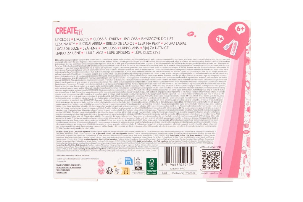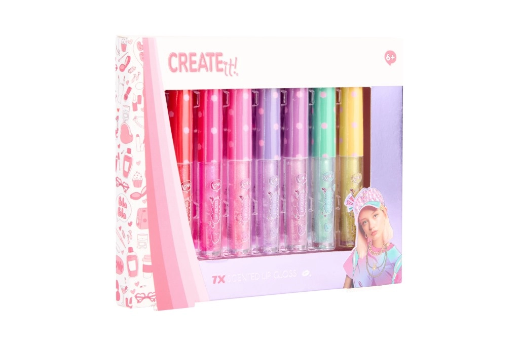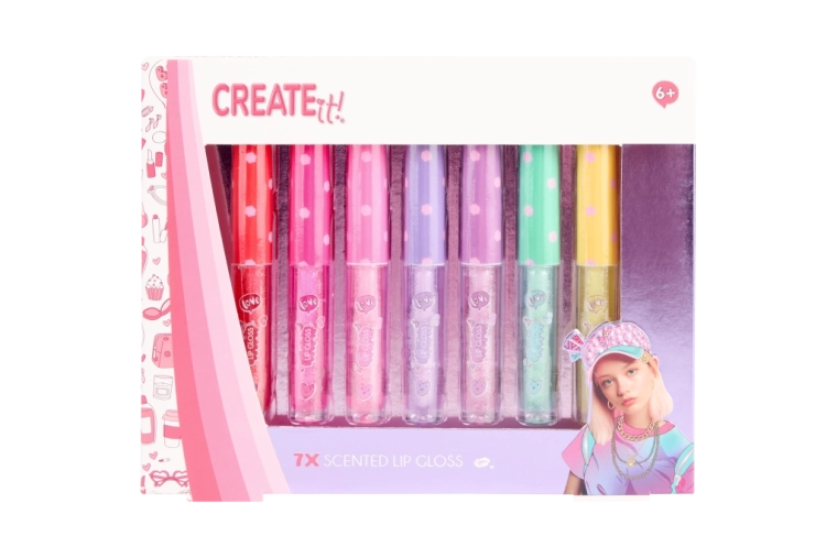 De CREATE IT!-set brengt zeven kleurrijke glosses met een glinsterende finish die de lippen prachtig laten stralen en een subtiele kleurtint geven. De lichte textuur brengt gemakkelijk aan en is geschikt voor dagelijks gebruik. Elke gloss heeft een andere geur, zodat je extra kunt genieten van fun en creativiteit bij het kiezen.