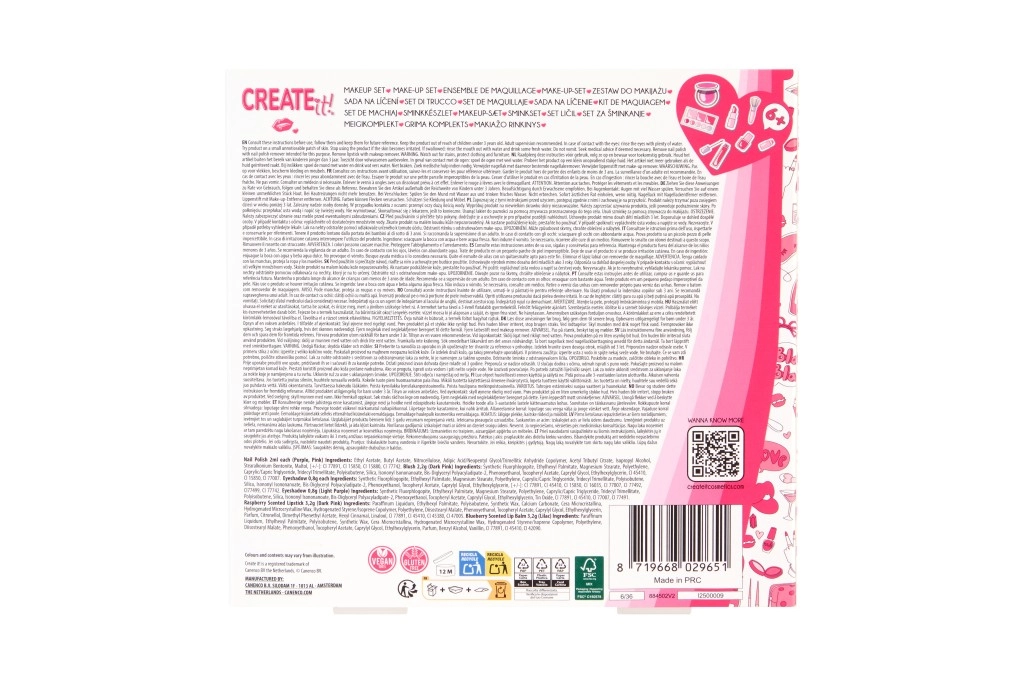 Ontdek speels en veilig plezier met de stijlvolle kinder make-upset CREATE IT! Pink Turquoise. Deze kleurrijke cosmeticaset voor kleine beautyfans vanaf 6 jaar bevat alles wat je nodig hebt voor creatief make-up en nagelstyling: 6 glinsterende oogschaduws, 2 nagellakken, haarkrijt, lipbalsem, lippenstift, een grote kwast en een kleine dubbelzijdige applicator.