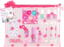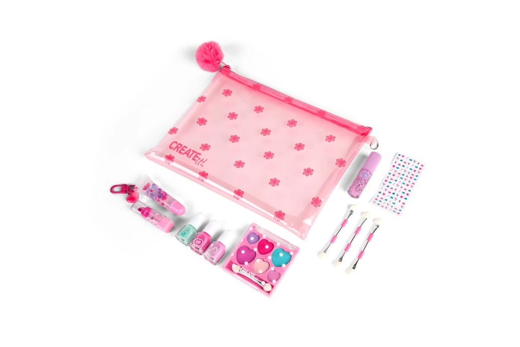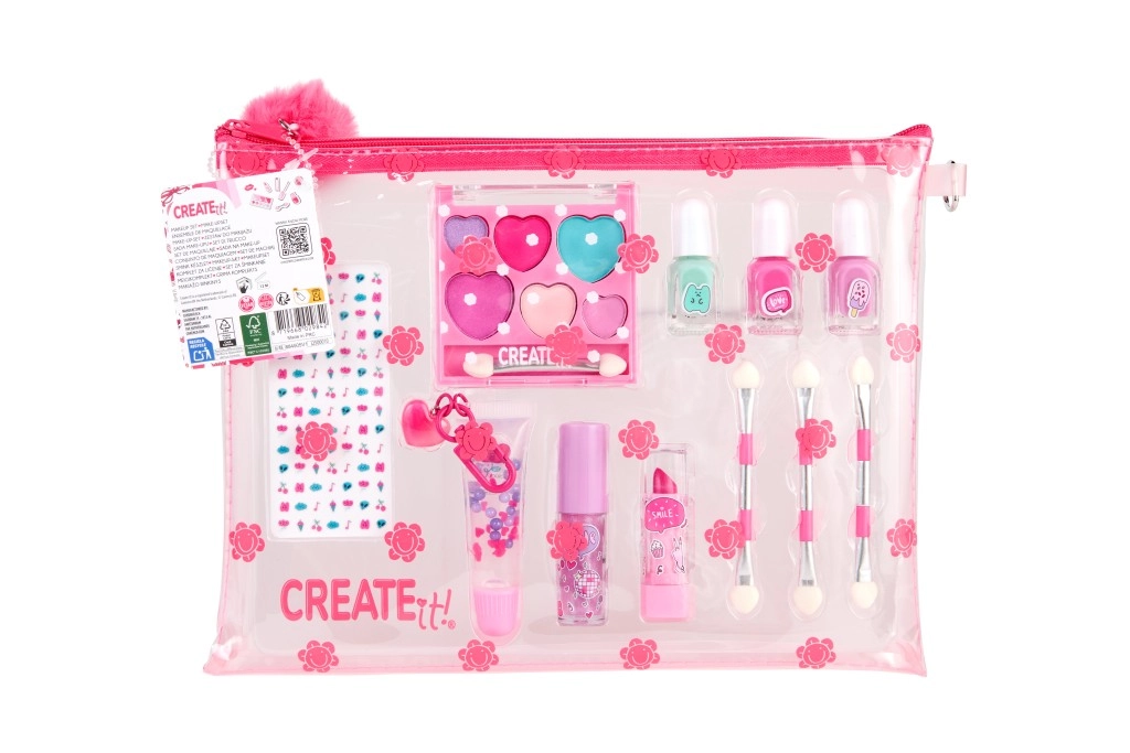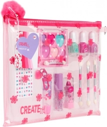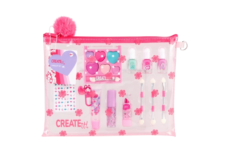 Schattige kinderset make-up in een transparant tasje, ideaal voor kleine beautyliefhebbers. Bevat alles voor speelse make-up en nagelversiering: 3 nagellakken, lipgloss, lippenbalsem, 3 applicators en nagelstickers. Het praktische tasje met pompon is decoratief en houdt alle cosmetische accessoires netjes bij elkaar.