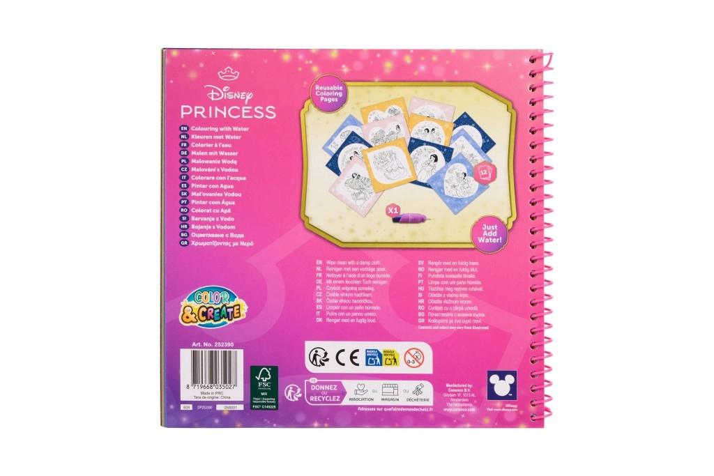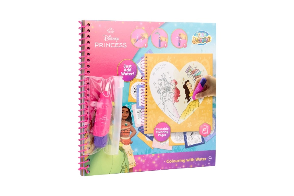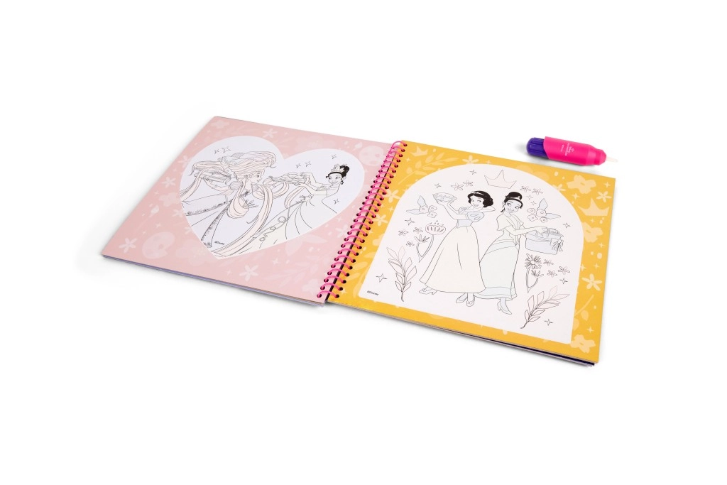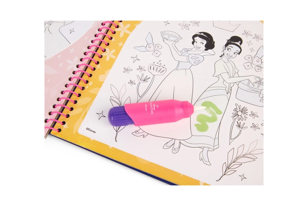 Ontdek het betoverende kleurboek met thema’s van DISNEY Prinsessen, dat werkt op basis van waterschilderei. Vul de meegeleverde penseel met water, ga over de afbeelding en de kleuren verschijnen vanzelf. Na het drogen verdwijnen de kleuren weer, waardoor het boek herbruikbaar is – ideaal voor onderweg en voor creatief plezier thuis.