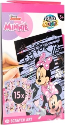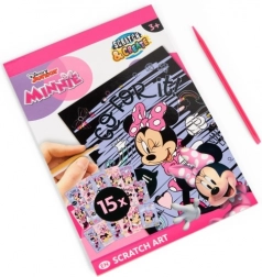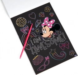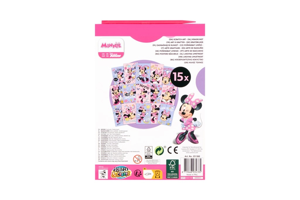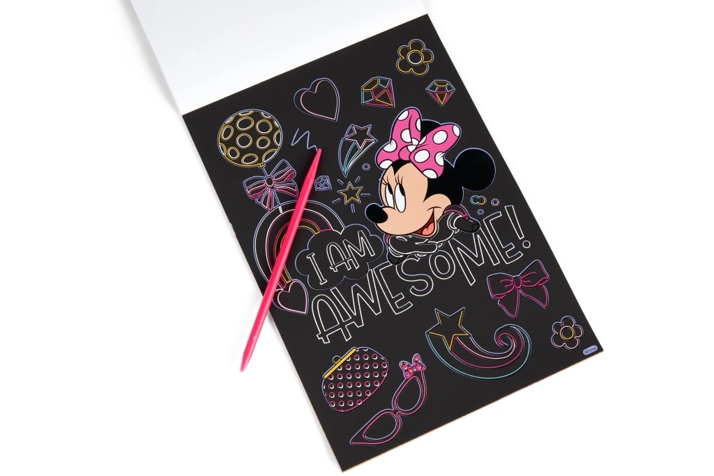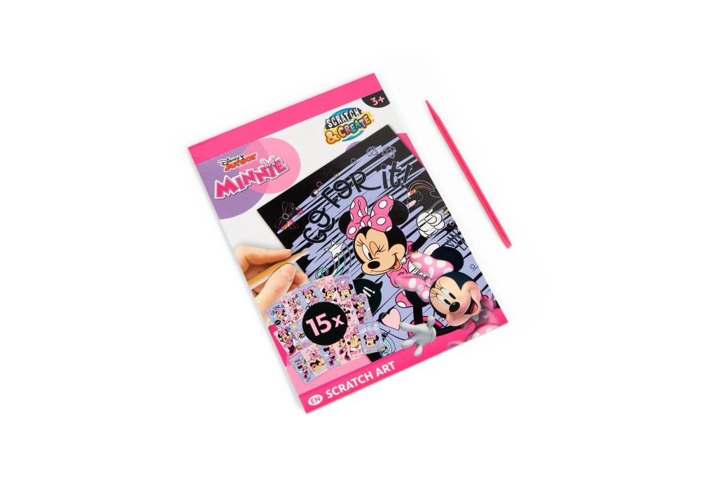Onder de zwarte laag verbergen zich levendige kleuren en MINNIE‑motieven die kinderen met het krasstokje onthullen – eenvoudig, leuk en verslavend creatief.