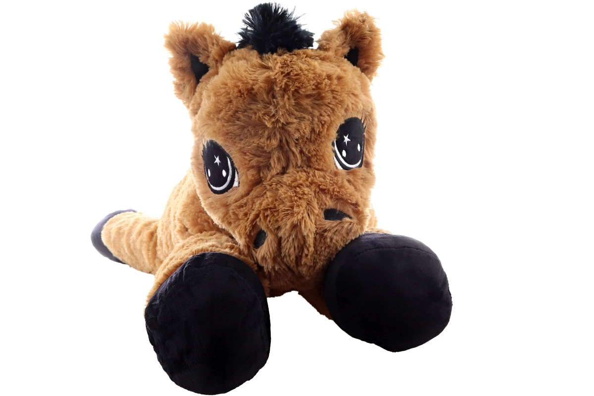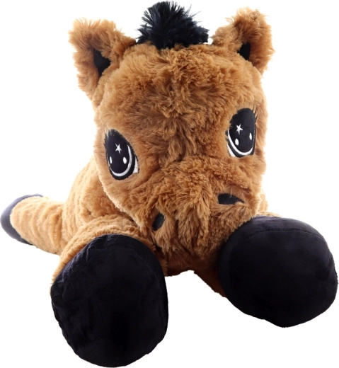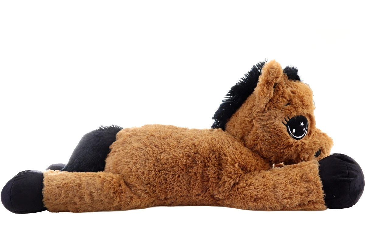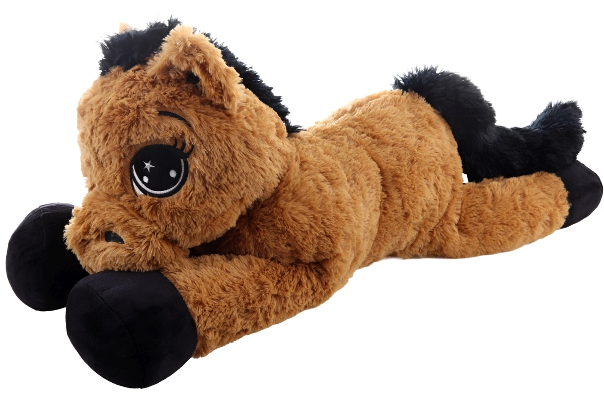 Dit bruine liggende pluchen paardje verrukt vanaf de eerste aanraking. Het heeft grote geborduurde ogen, een zachte manen en staart en fungeert zowel als knuffelige vriend als comfortabele steun bij lezen of het kijken van verhaaltjes. De afmetingen 80 × 32 × 25 cm garanderen voldoende ruimte om te knuffelen en te ontspannen.