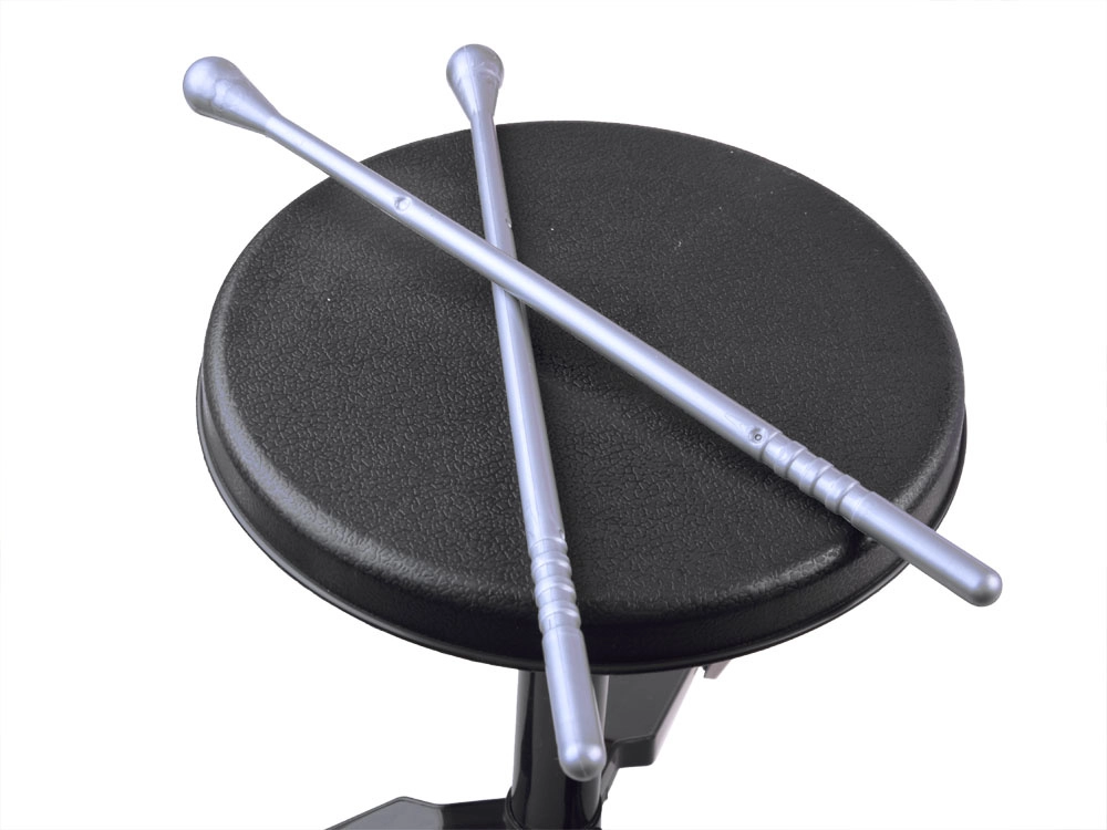 - Compleet pakket: grote trom met pedaal, 2 mid-toms, 2 kleine trommels, bekken, 2 drumstokken, krukje.
