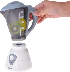 De kinderkeuken blender is een geweldige aanvulling op elke kinderkookhoek. Hij bootst een echt apparaat na, waardoor het spel nog leuker en realistischer wordt. De kan met deksel is afneembaar, heeft een praktische handgreep en een maatschaal tot 200 ml. Na het indrukken van de ON/OFF-knop gaat een rode LED branden, binnenin draaien gesimuleerde messen rond en de blender maakt een authentiek geluid.