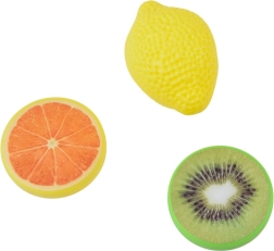 Kleurige kunststof vruchten – citroen, kiwi en sinaasappel – stimuleren de fantasie en gevarieerde kookscènes.