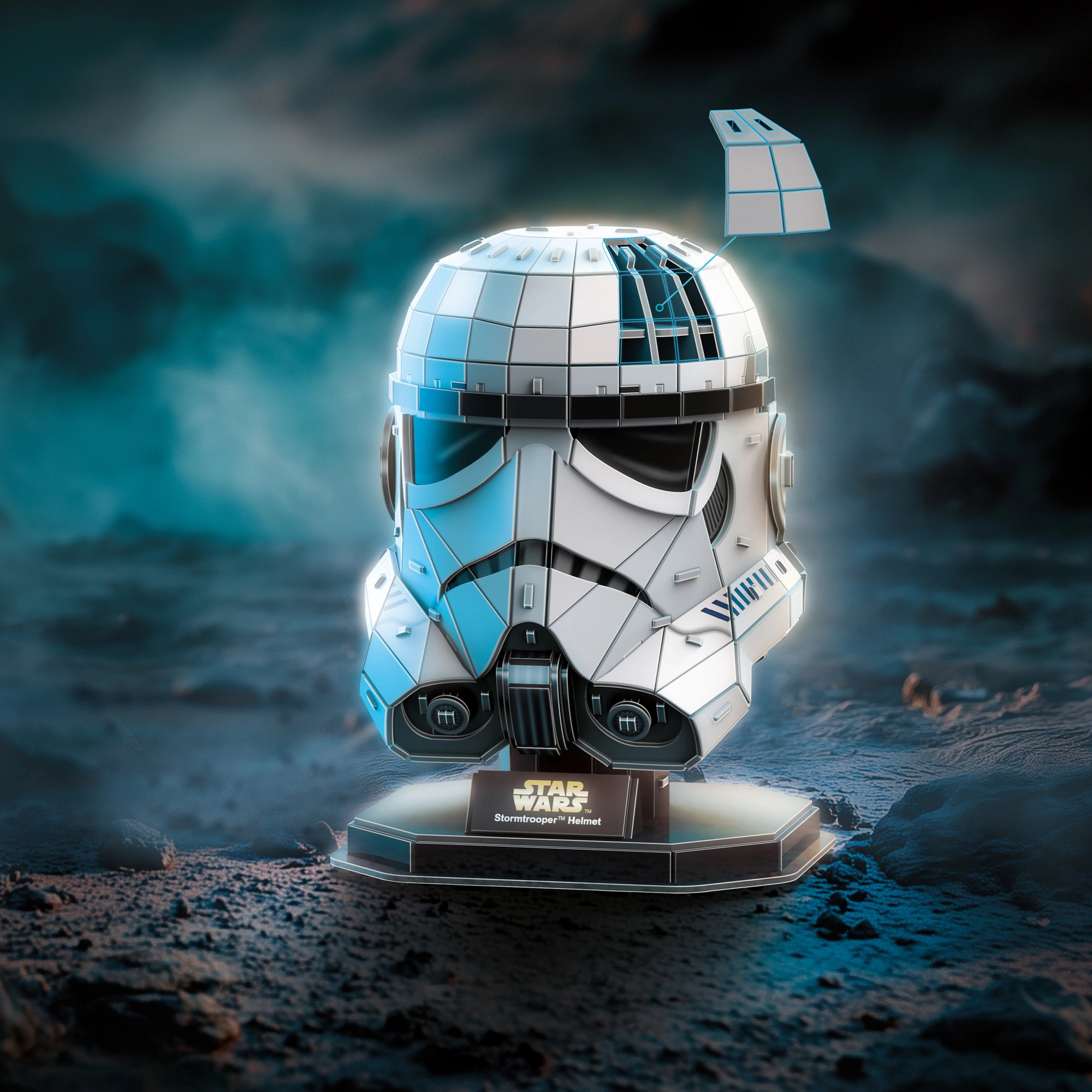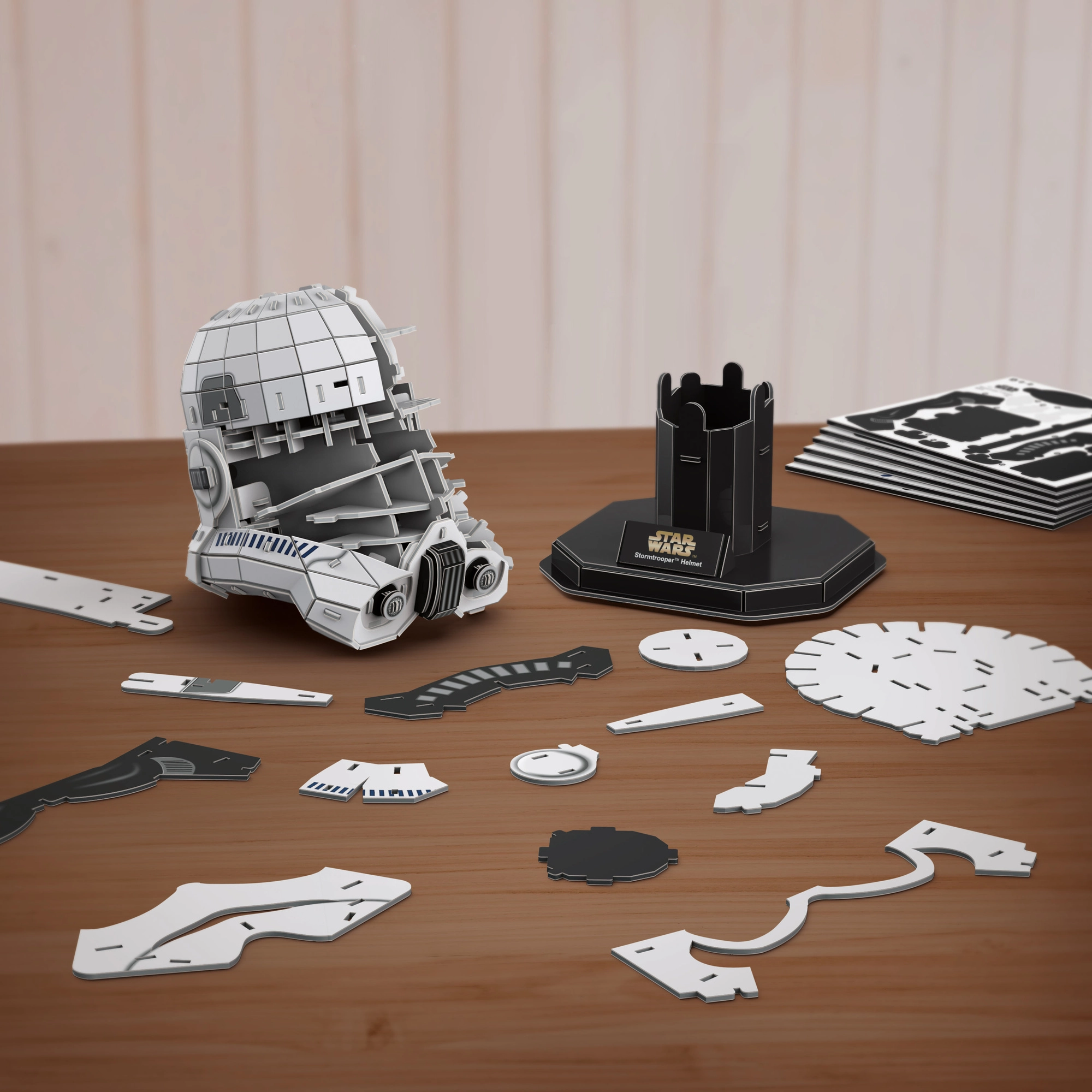 Dit zorgvuldig ontworpen 3D-model van de Stormtrooper-helm zal elke Star Wars-fan bekoren. De set bevat 121 voorgevormde onderdelen op 6 kaarten, die je eenvoudig uitdrukt en volgens de duidelijke handleiding in elkaar zet. Het resultaat is een compact model van 12 × 12 × 16 cm met standaard en naamplaatje voor een indrukwekkende presentatie.