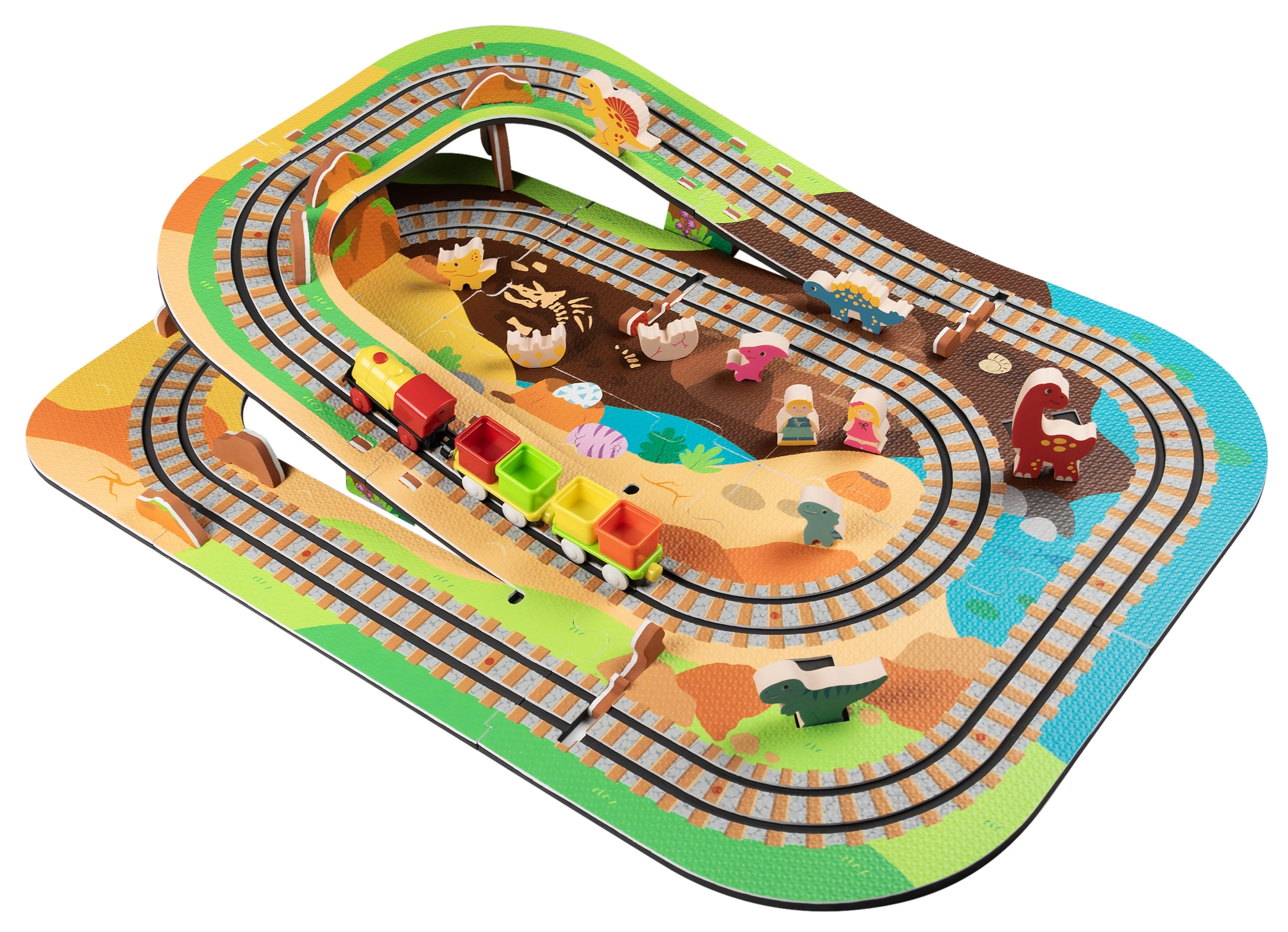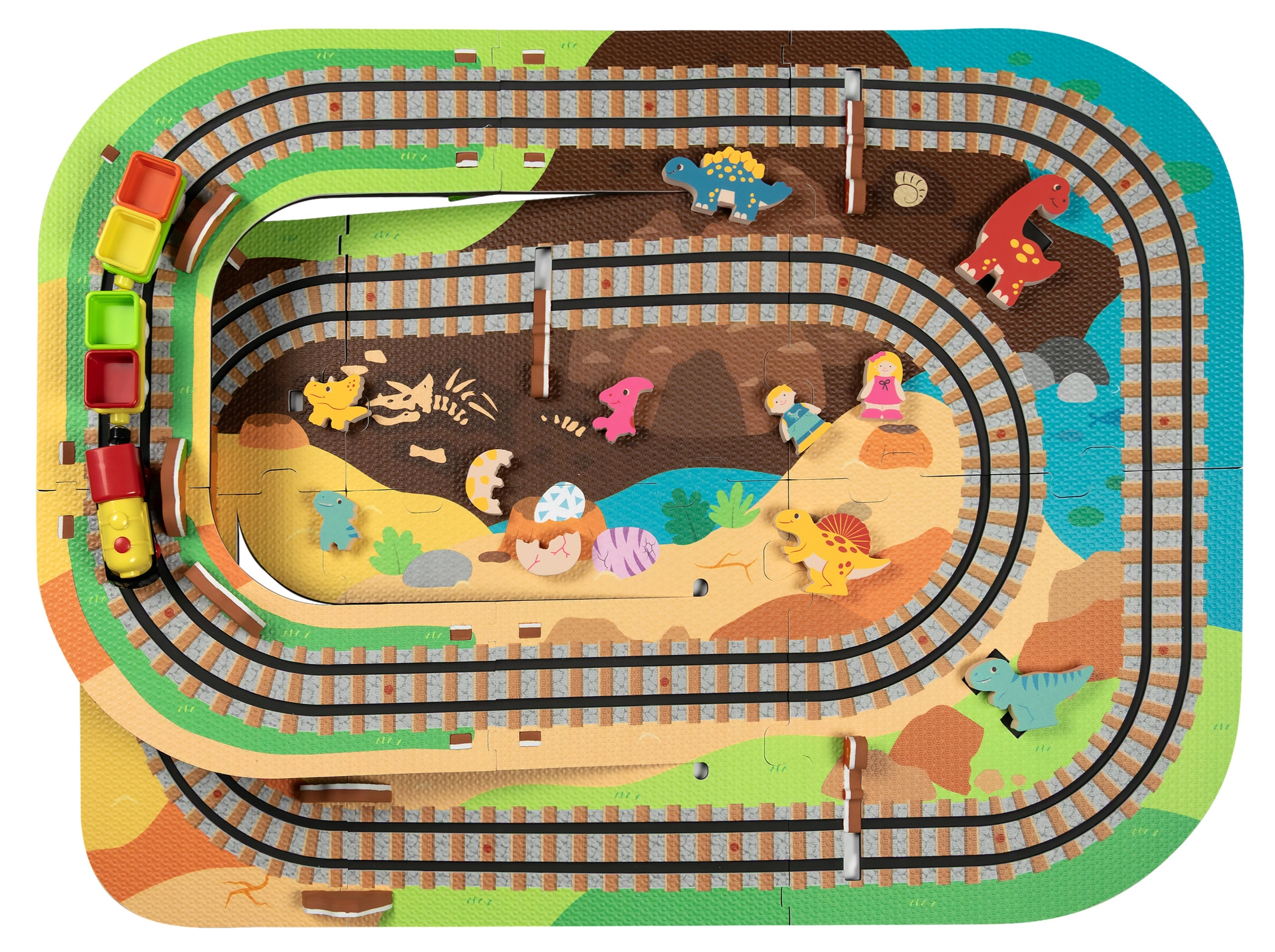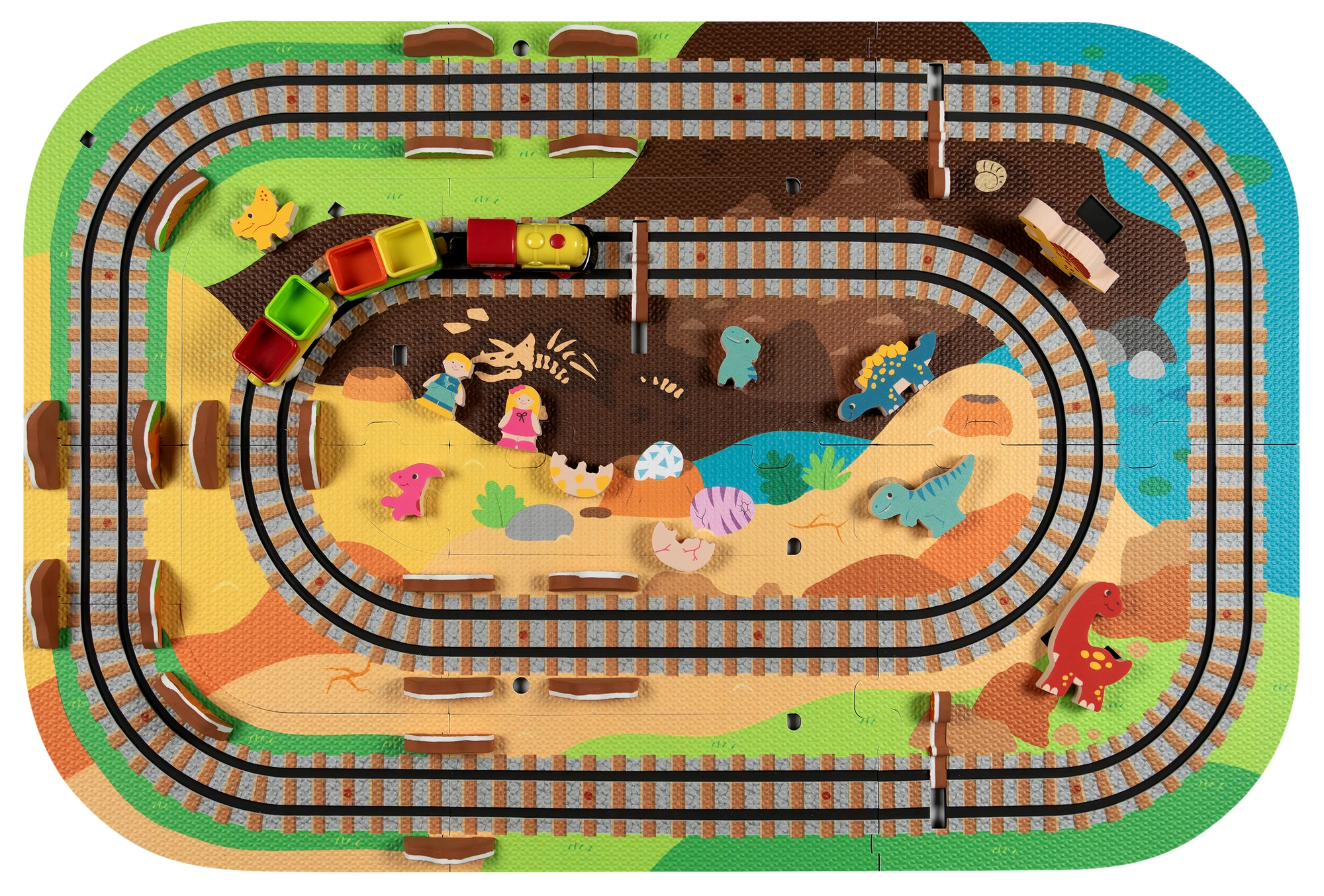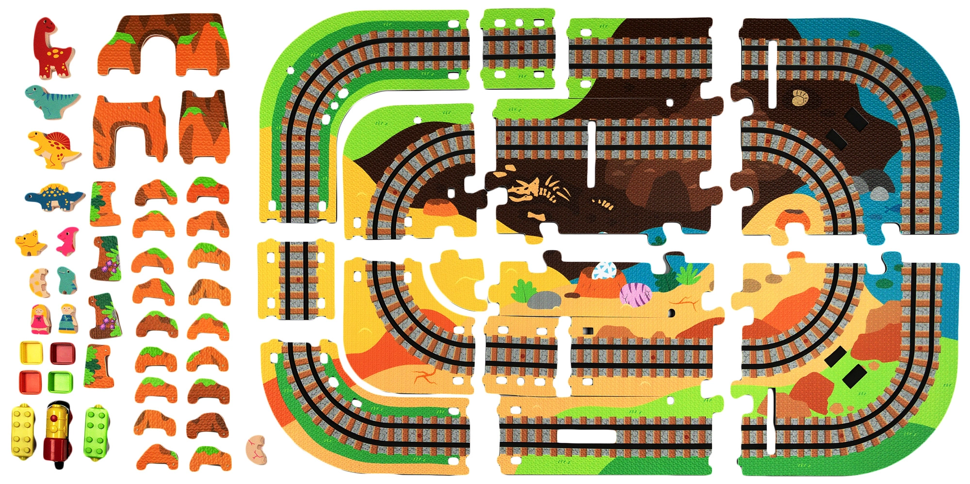 Deze creatieve set combineert EVA-schuimpuzzels met dinothema en een spoorbaan voor het treintje. De onderdelen klikken eenvoudig in elkaar en maken het mogelijk vlakke trajecten en steile hellingen te bouwen. De locomotief met wagonnetjes (op batterijen) beweegt soepel over het spoor en kinderen kunnen het spel verrijken met houten/schuimfiguren van dinosaurussen, rotsen en tunnels.