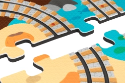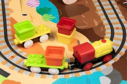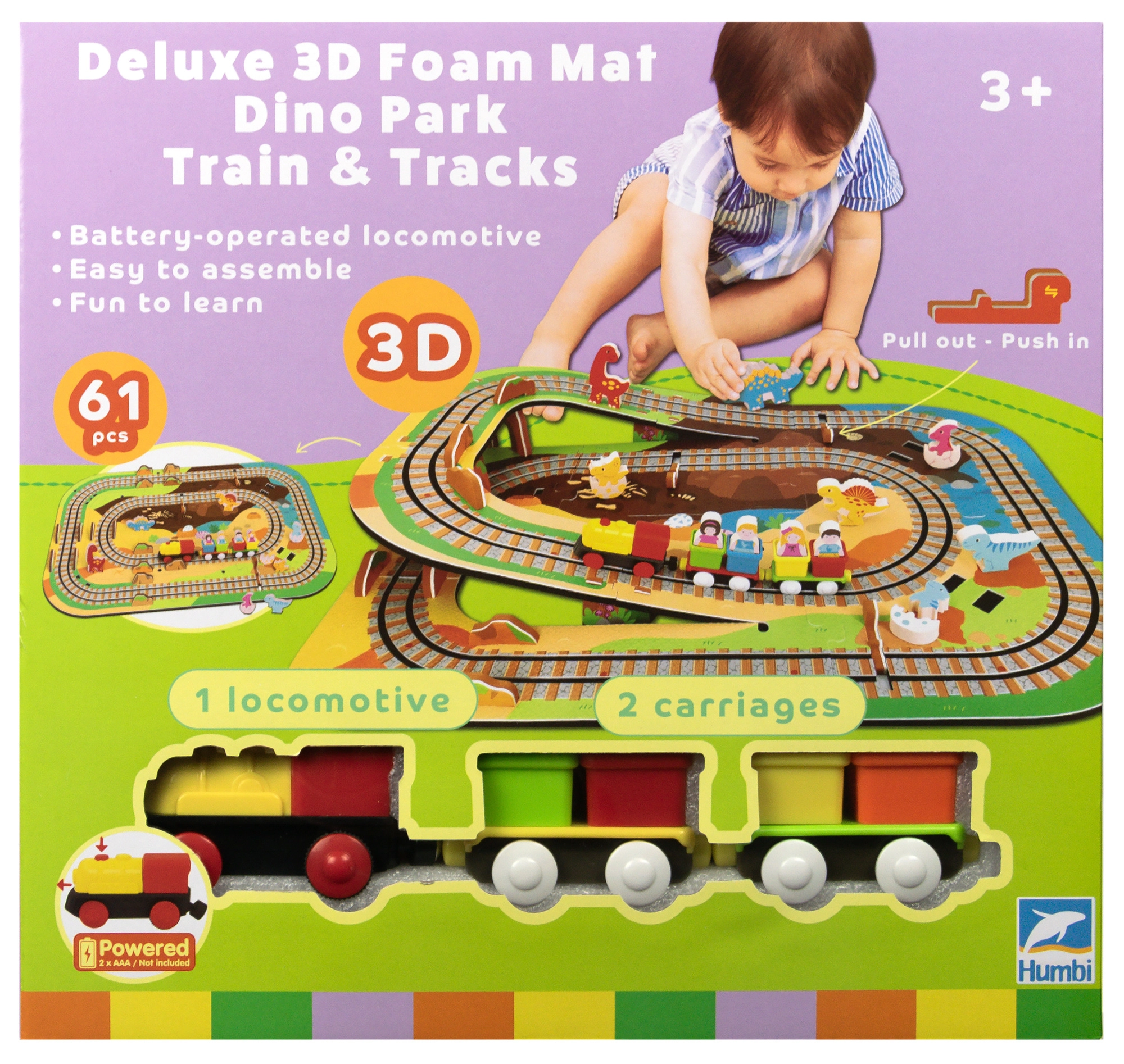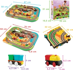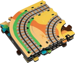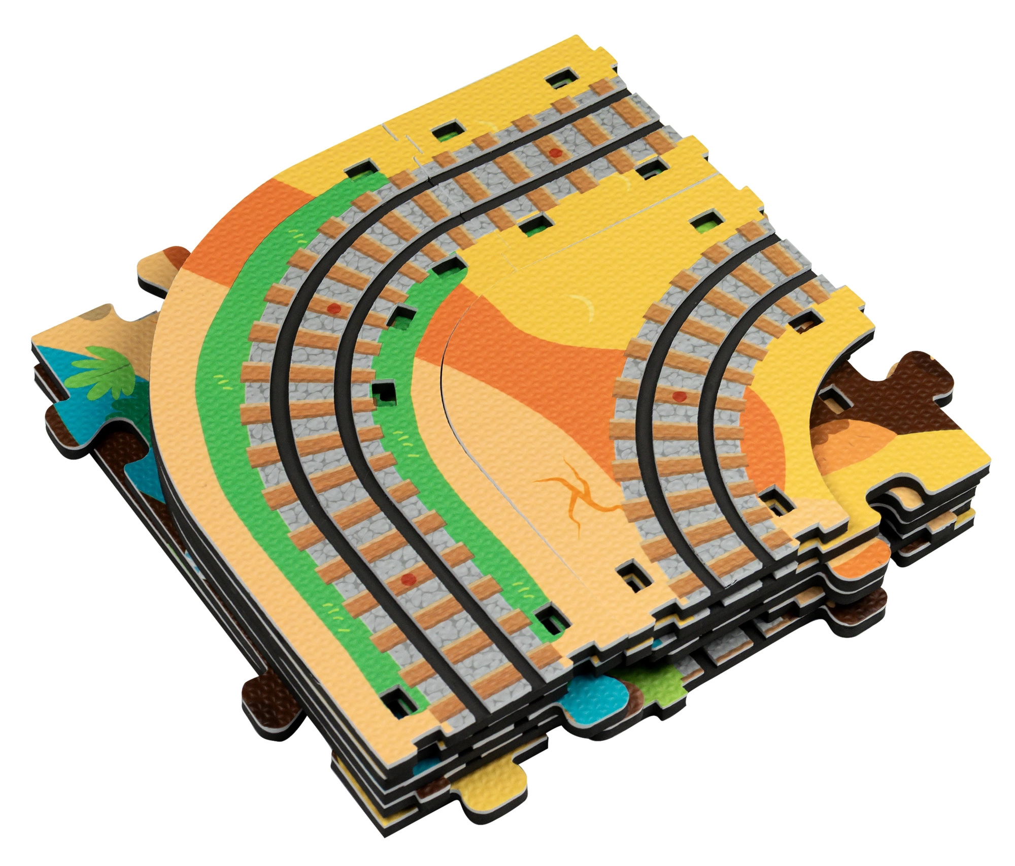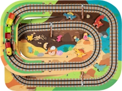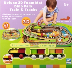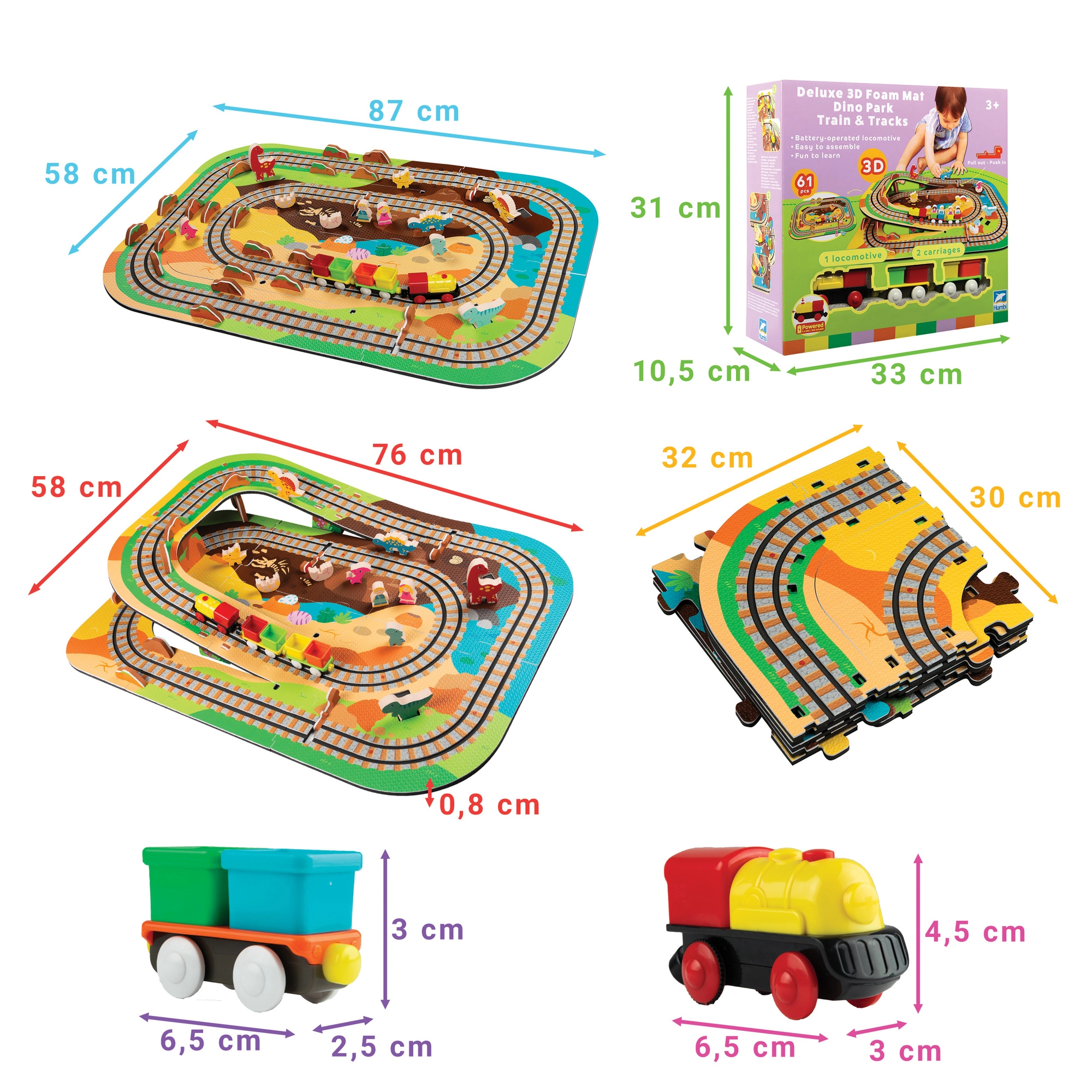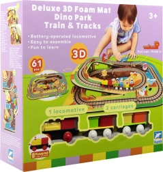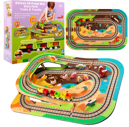 Deze creatieve set combineert EVA-schuimpuzzels met dinothema en een spoorbaan voor het treintje. De onderdelen klikken eenvoudig in elkaar en maken het mogelijk vlakke trajecten en steile hellingen te bouwen. De locomotief met wagonnetjes (op batterijen) beweegt soepel over het spoor en kinderen kunnen het spel verrijken met houten/schuimfiguren van dinosaurussen, rotsen en tunnels.