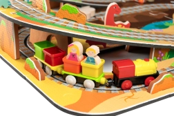 Inbegrepen zijn 12 raildelen, 42 thematische accessoires en praktische bakjes voor in de wagonnetjes om passagiers of kleine spulletjes te vervoeren. Het zachte, duurzame en geurloze EVA-materiaal zorgt voor comfortabel en veilig spelen. Het product voldoet aan EN 71, RoHS 2011/65/EU en heeft een CE-markering.