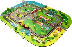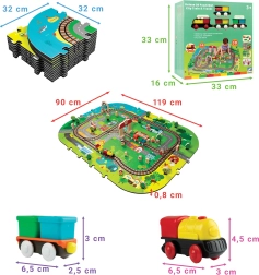 Er zijn 34 accessoires inbegrepen – figuurtjes, borden, bomen en andere decoraties voor realistisch spel. De trein met wagonnetjes kan eenvoudig worden gekoppeld, lading in doosjes worden vervoerd en de scène naar eigen fantasie worden aangepast. De set is ideaal als cadeau, voldoet aan EN 71, RoHS 2011/65/EU en heeft CE.