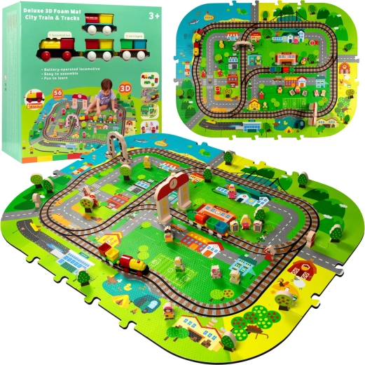 Deze creatieve set combineert een zachte vloermat met een 3D-stad en een spoorbaan. Kinderen bouwen een kleurrijk decor met straatjes, gebouwen, luchthaven, boerderij, zee, camping en bergen, en laten de batterijlokomotief soepel rijden over de samengestelde baan. Dikke EVA-schuimdelen dempen schokken, isoleren tegen kou en creëren een veilige speelplek.