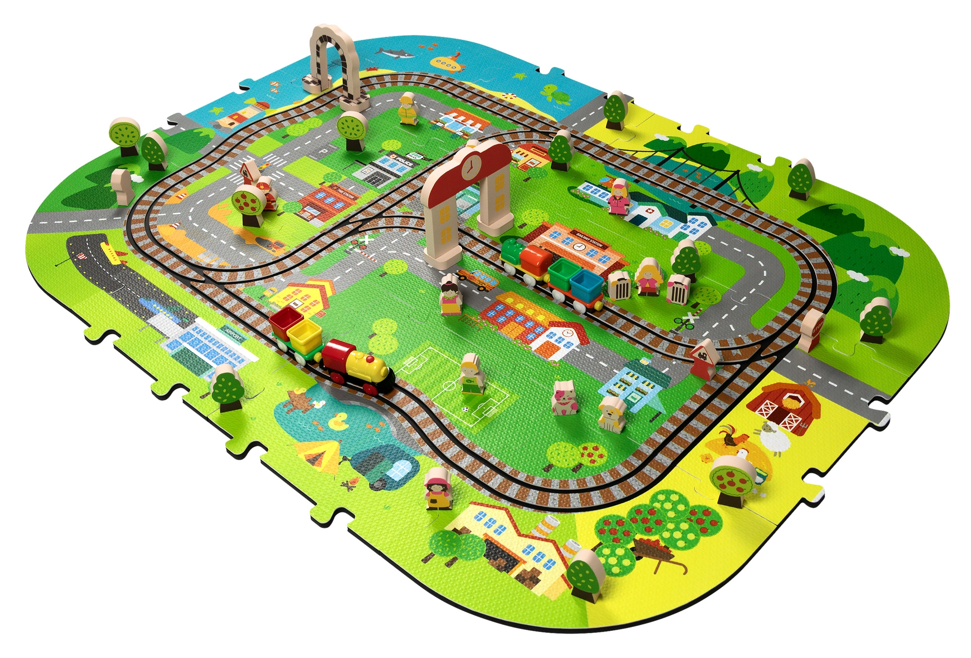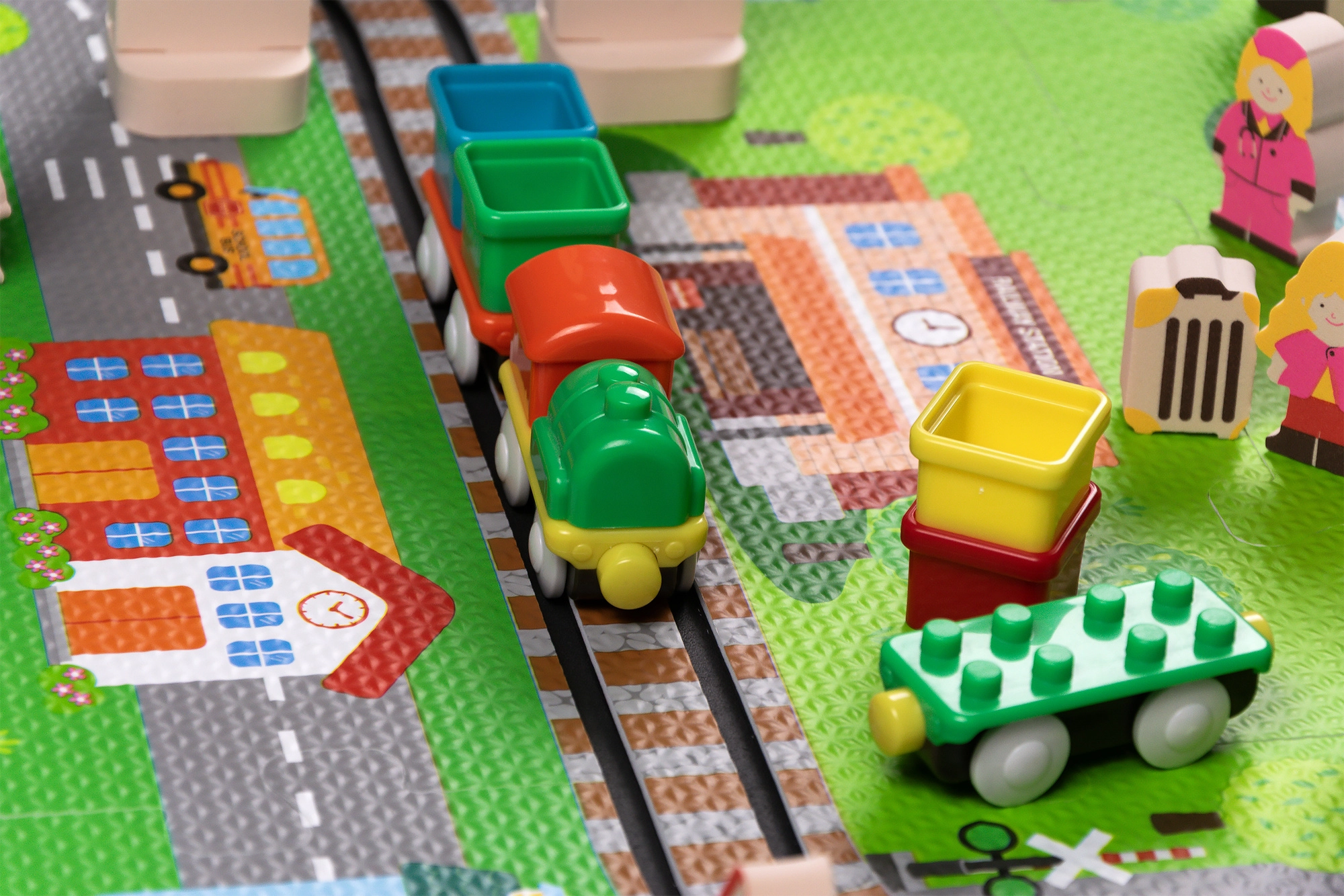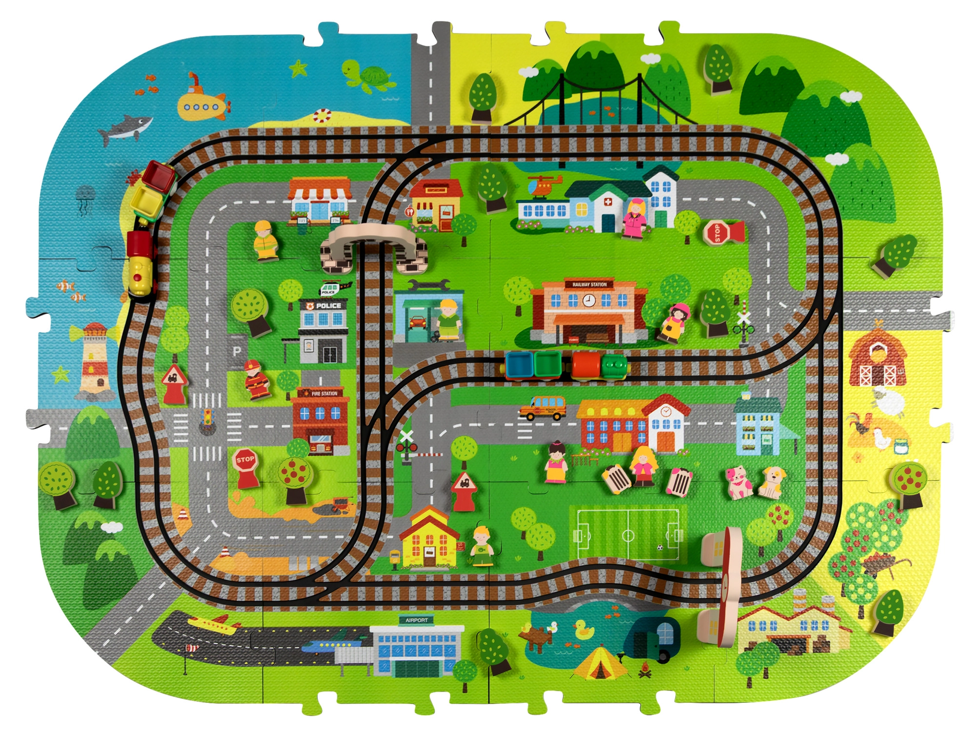 Verbind de stukken als een puzzel en maak je eigen stad met straten, spoorbanen, gebouwen en natuur. Dikke EVA-delen behouden hun vorm en zijn gemakkelijk schoon te maken.