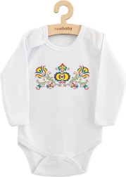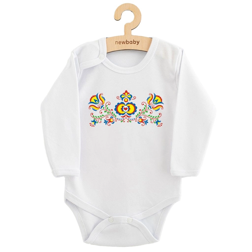 Stijlvolle babyromper met lange mouwen en folkloristische motief van het merk NEW BABY combineert een traditioneel patroon met een modern design. Gemaakt van 100% zachte katoen, mild voor de gevoelige huid, met praktische drukknoopsluiting op de schouder en tussen de beentjes voor gemakkelijk aankleden en verschonen. Gecertificeerde kleurstoffen en materiaal met OEKO‑TEX STANDARD 100 garanderen veiligheid, ook voor pasgeborenen.