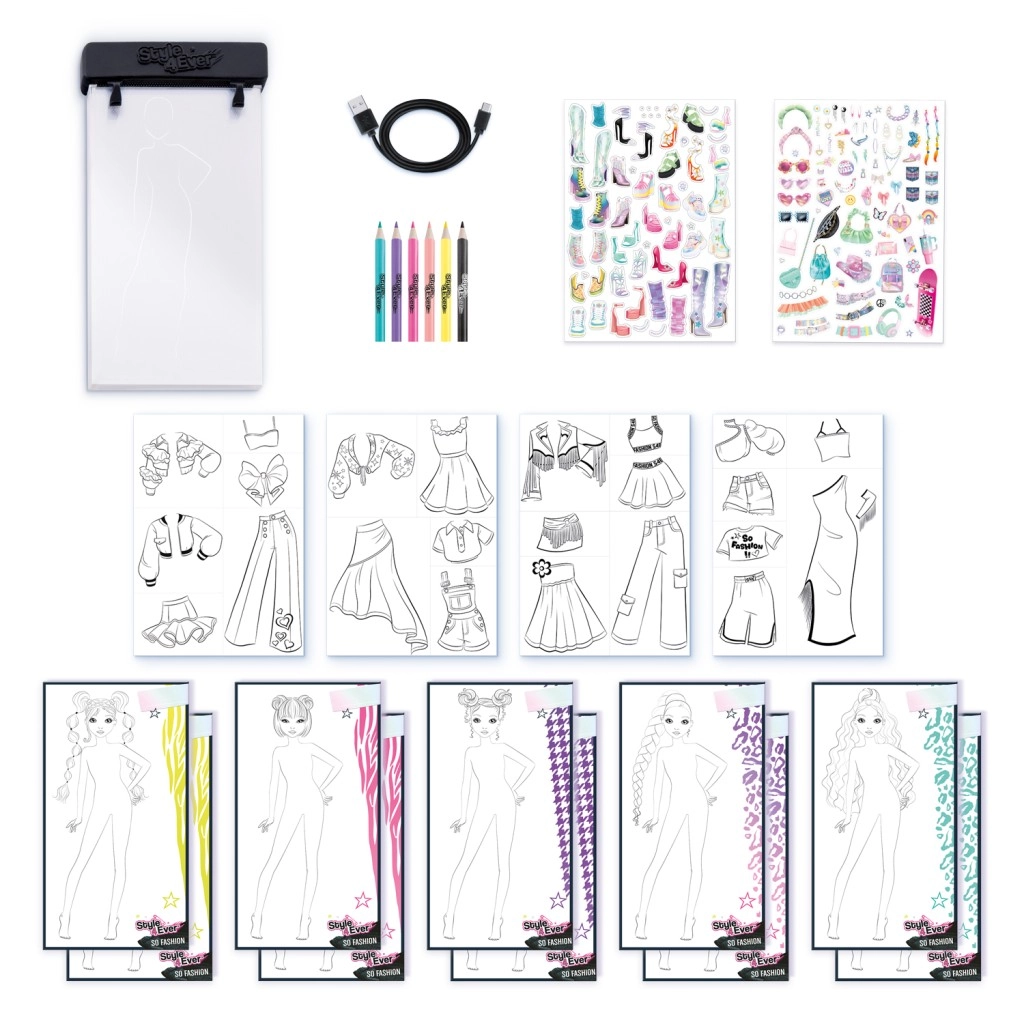 Ontdek de creatieve modewereld met de Style4Ever – ontwerpset met verlichte lichtplaat, die kinderen urenlang creatief speelplezier biedt. Maak je eigen modieuze ontwerpen met behulp van sjablonen, modellen, stickers en kleurpotloden. Inclusief USB‑C‑kabel voor eenvoudig opladen. Geschikt voor kinderen vanaf 6 jaar.