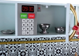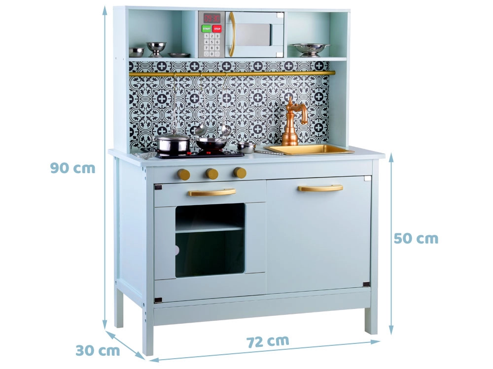 Deze elegante mintgroene kinderkeuken met zwart-witte mozaïek valt op door de hoogwaardige afwerking van hout en MDF. Realistische elementen zoals een inductiekookplaat met licht en geluid, een magnetron en een oven met transparante deur nemen kinderen mee in de wereld van fantasie en rollenspel.