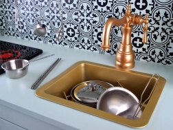 De grote gouden spoelbak en retro kraan benadrukken de premium uitstraling van de keuken en nodigen uit om af te wassen en ingrediënten voor te bereiden.