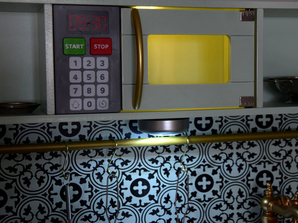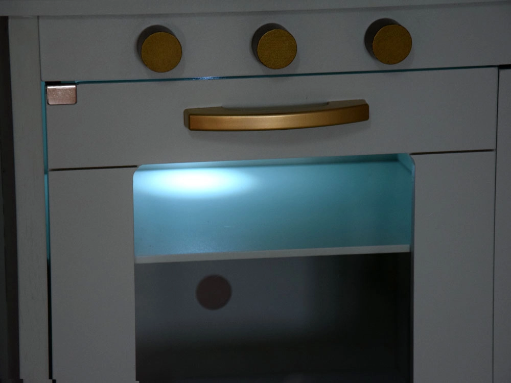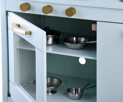 Inclusief een gouden gootsteen met vintage kraan, gouden knoppen en grepen en een praktische stang voor het ophangen van gerei. De uitgebreide set roestvrijstalen accessoires (pan met deksel, steelpan, vergiet, kommen, bordjes, bestek en gereedschap) laat kinderen serveren en “koken” als in een echte keuken.