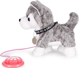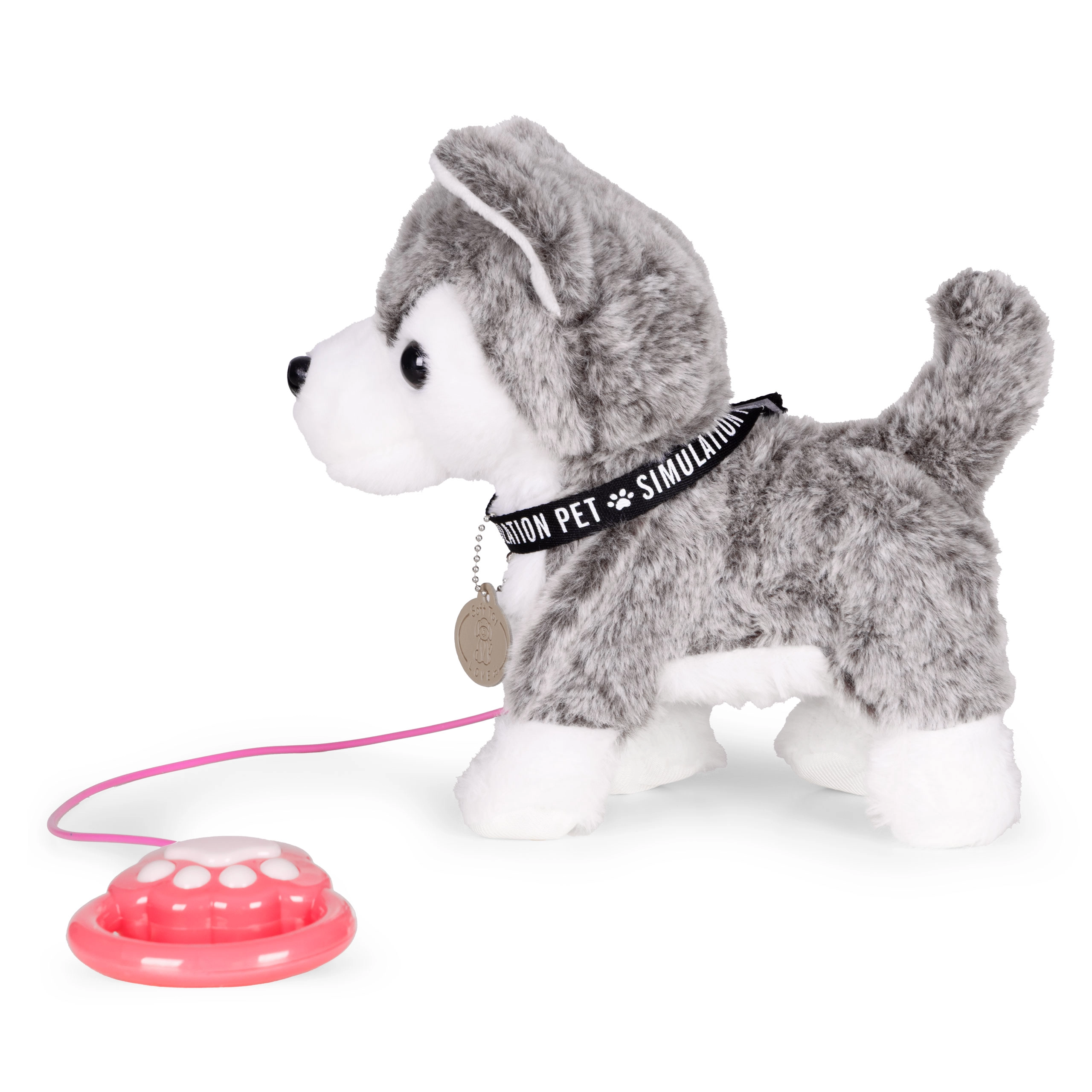 Wanneer je op de knop op de lijn drukt, begint de husky te lopen, kwispelt vriendelijk met zijn staart en knikt met zijn hoofd – net als een echt puppy.