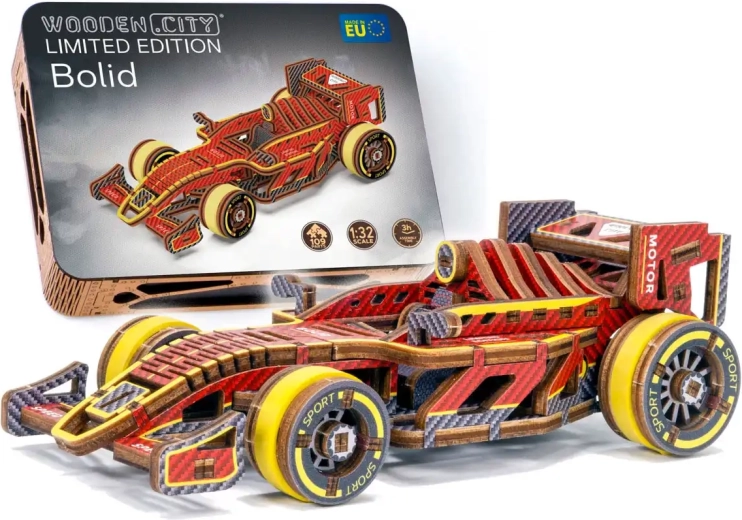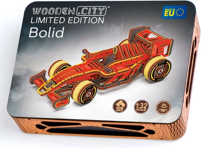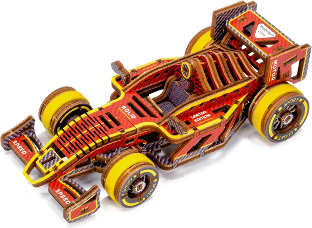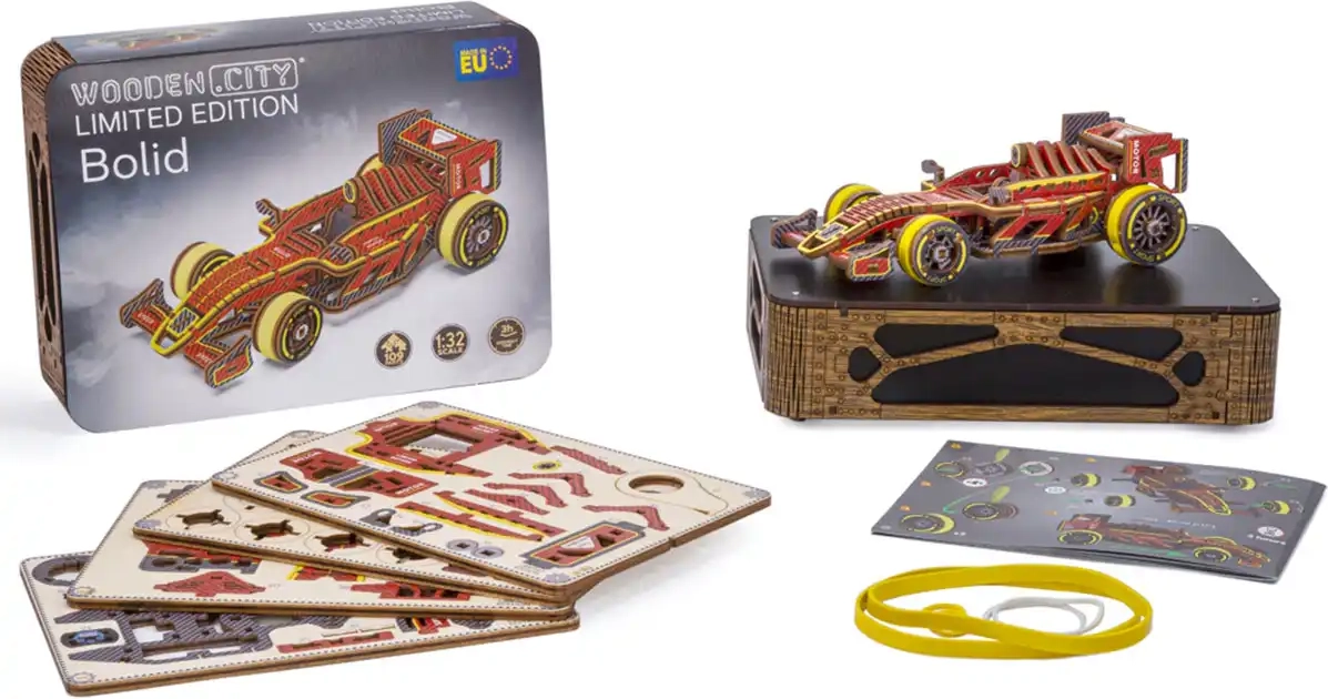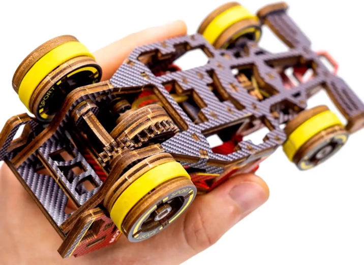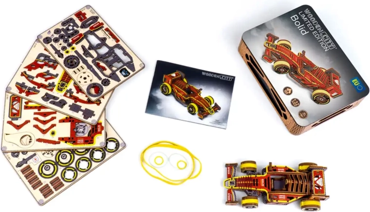 Ontdek de wereld van mechanische houten modellen met de gelimiteerde racebolide van WOODEN CITY. Dankzij de preciese laseruitsnede uit kwalitatief berkenmultiplex past elk onderdeel precies op zijn plek en ontstaat een functioneel model met soepele werking. De rubberaandrijving haalt na het opwinden tot 1 meter, terwijl de bestuurbare vooras de rit extra realistisch maakt.