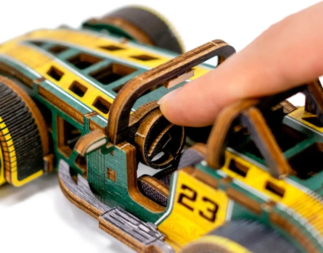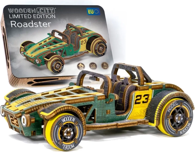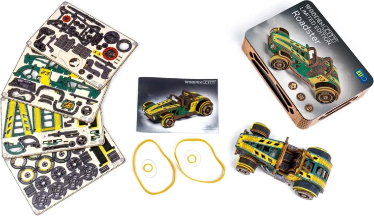 De Houten 3D-puzzel Roadster – limited edition brengt het plezier van bouwen én de voldoening van een afgewerkt mechanisch model. Dankzij nauwkeurig lasergesneden onderdelen van ecologisch berkenmultiplex zet u zonder lijm een verfijnde wagen in elkaar met realistische details en een soepele werking.