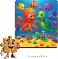 De houten puzzel WOODEN CITY met een octopus en een schildpad neemt kinderen mee naar een fascinerende onderwaterwereld. Elk stukje is met de grootste precisie gemaakt zodat het perfect past en resulteert in een betoverende scène van circa 19,3 × 17,4 cm.