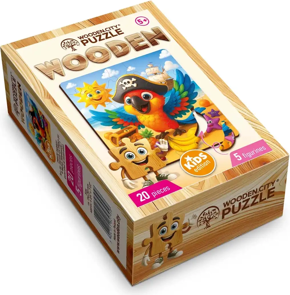 Ontdek de charme van hoogwaardige houten puzzels van WOODEN CITY met het motief van een piratenpapegaai. De set met 20 stukjes biedt 5 uniek gevormde stukjes, gladde randen zonder splinters dankzij precieze laserbewerking en ondersteunt de concentratie, geduld en creativiteit van kinderen. Inclusief een los voorbeeldblad voor makkelijker puzzelen.