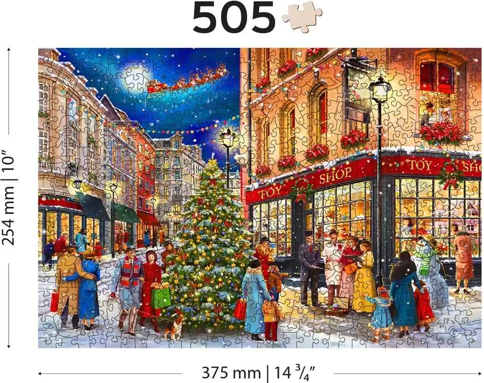 Ontdek de magie van Kerst met een premium houten puzzel die zowel puzzelliefhebbers als cadeaugevers zal bekoren. Het motief van een kerststraat met boom, zangertjes en knusse etalages zorgt voor een aangename feestelijke sfeer en is een perfecte activiteit voor koude avonden.