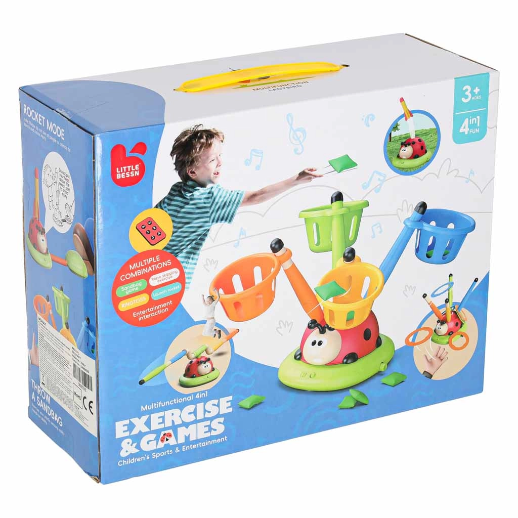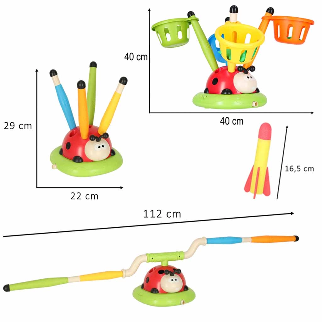 Een spel dat niemand laat stilzitten: de roterende springhindernis test je reactievermogen, de luchtlanceerder schiet raketten de lucht in en doelwerpen voegt een vleugje sportieve competitie toe. Het interactieve lieveheersbeestje met licht en geluid motiveert tot bewegen en maakt van elke ronde een nieuwe uitdaging.