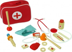 De set bevat 11 realistische accessoires: een spuit, thermometer, capsule, vitaminen, bloeddrukmeter met manchet, stethoscoop, dokters hamertje, medicijnflesje, zaklamp en houten spateltje. Dankzij de praktische tas is alles eenvoudig op te bergen en mee te nemen.