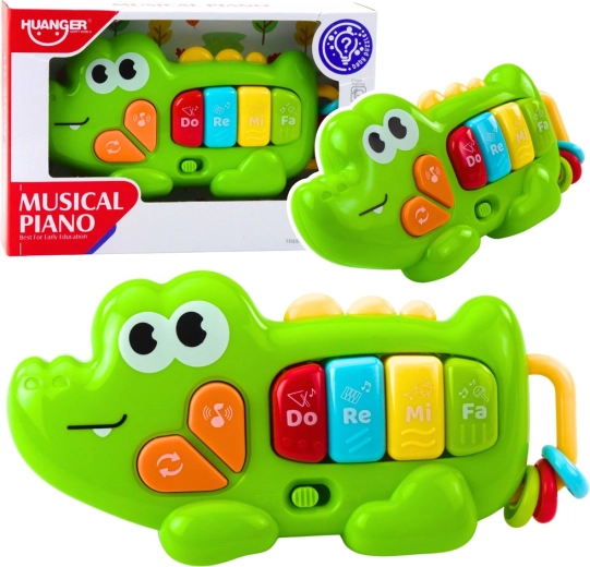 Kleurrijke interactieve krokodil-piano die elke kleine ontdekkingsreiziger zal verrassen. Biedt vier toetsen Do, Re, Mi, Fa, vrolijke melodieën en geluiden en aanvullende manipulatieringen voor de ontwikkeling van de fijne motoriek. Dankzij de compacte afmetingen ideaal voor thuis en onderweg, en het veilige ontwerp met afgeronde randen is aangepast aan kinderhandjes.