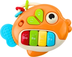 Het muzikale vis-pianootje is het ideale eerste muziekspeeltje voor peuters. De vier duidelijk gemarkeerde toetsen Do, Re, Mi, Fa spelen bij het indrukken vrolijke melodieën en afzonderlijke tonen af, waardoor het gevoel voor ritme en het waarnemen van geluid op een natuurlijke manier wordt ontwikkeld. De ergonomische visvorm ligt goed in een klein handje, terwijl de lichte behuizing en de gladde, afgeronde randen zorgen voor veilig en comfortabel gebruik.